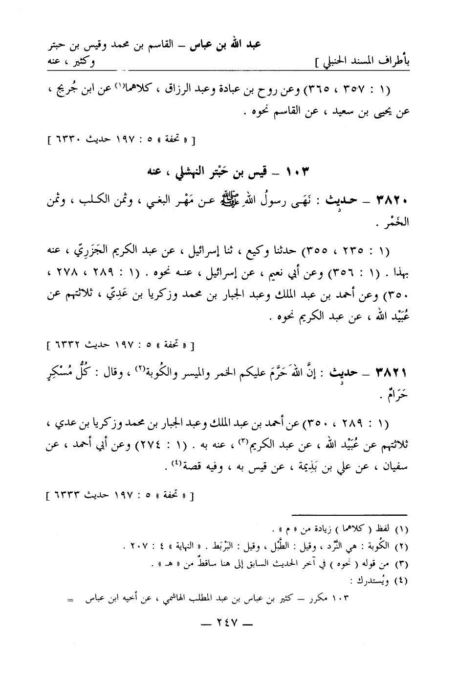3820 -[د] حديث: إنَّ الله حَرَّمَ عليكم الخَمْر والميسر والكُوبة، وقال كُلُّ مُسْكِرٍ حَرَام. (1: 289، 350) عن أحمد بن عبد الملك وعبد الجبار بن محمد وزكريا بن عَدِيّ، ثلاثتهم عن عُبَيد الله عن عبد الكريم، عنه به. (1: 274) وعن أبي أحمد، عن سفيان، عن علي بن بَذِيمة، عن قيس به، وفيه قصة.