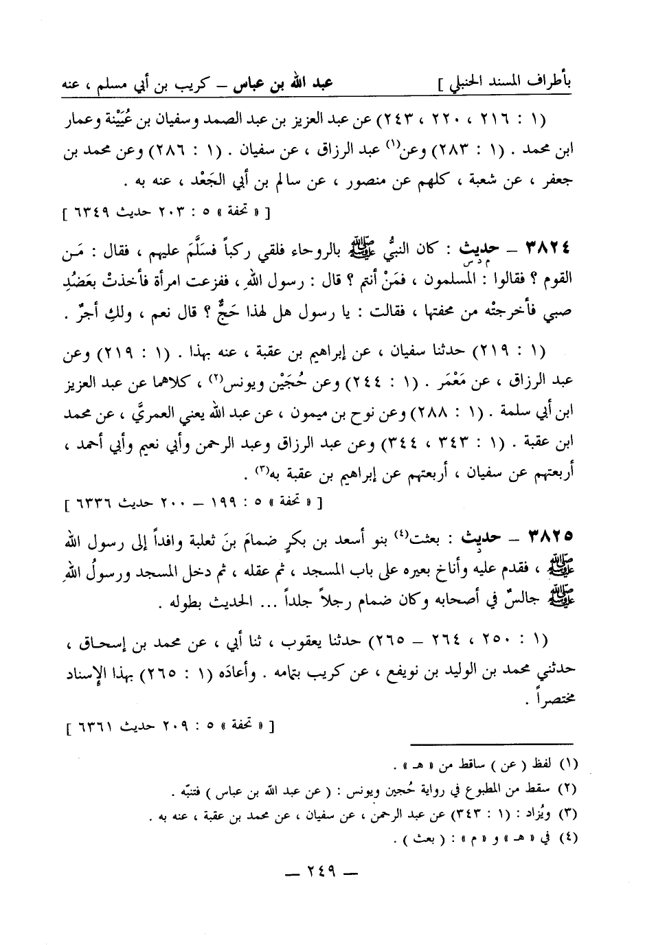 3824 -[د] حديث: بعثت بنو أسعد بن بكر ضمام بن ثعلبة وافداً إلى رسول الله صَلَّى اللَّهُ عَلَيْهِ وَسَلَّمَ فقدم عليه وأناخ بعيره على باب المسجد، ثم عقله، ثم دخل المسجد ورسولُ الله صَلَّى اللَّهُ عَلَيْهِ وَسَلَّمَ جالسٌ في أصحابه وكان ضمام رجلاً جلداً ... الحديث بطوله. (1: 250، 264 - 265) حَدَّثَنا يعقوب ثنا أبي عن محمد بن إسحاق، حَدَّثَني محمد بن الوليد بن نويفع، عن كُرَيْب بتمامه. وأعاده (1: 265) بهذا الإسناد مختصراً.
