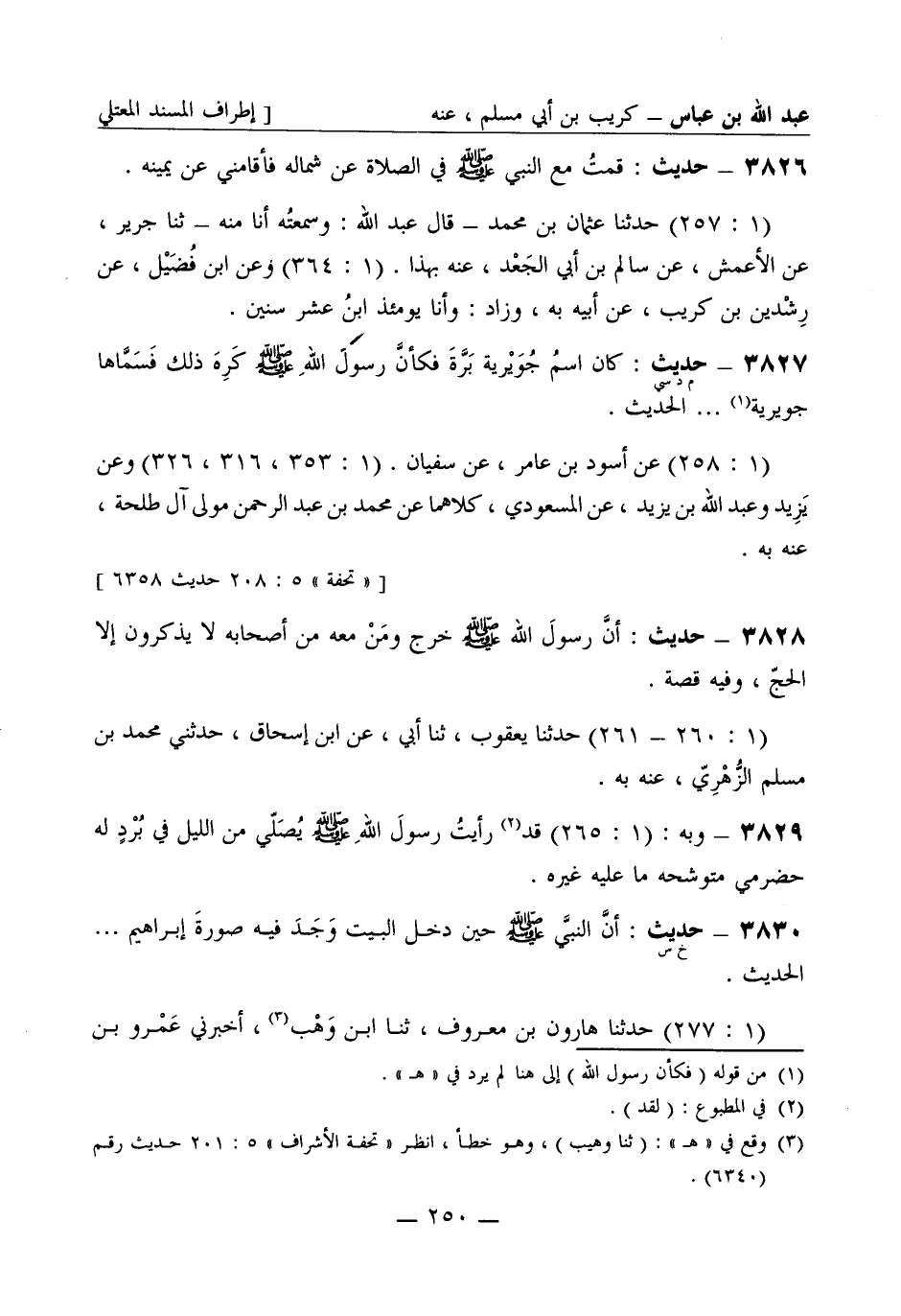 3826 -[م د سي] حديث: كان اسمُ جُوَيْرية بَرَّةَ فكأنَّ رسول الله صَلَّى اللَّهُ عَلَيْهِ وَسَلَّمَ كَرِه ذلك فسَمَّاها جُوَيْرية ... الحديث. (1: 258) عن أسود بن عامر، عن سفيان (1: 353، 316، 326) وعن يزيد وعبد الله بن يزيد، عن المسعودي كلاهما عن محمد بن عبد الرحمن مولى آل طلحة، عنه به.
