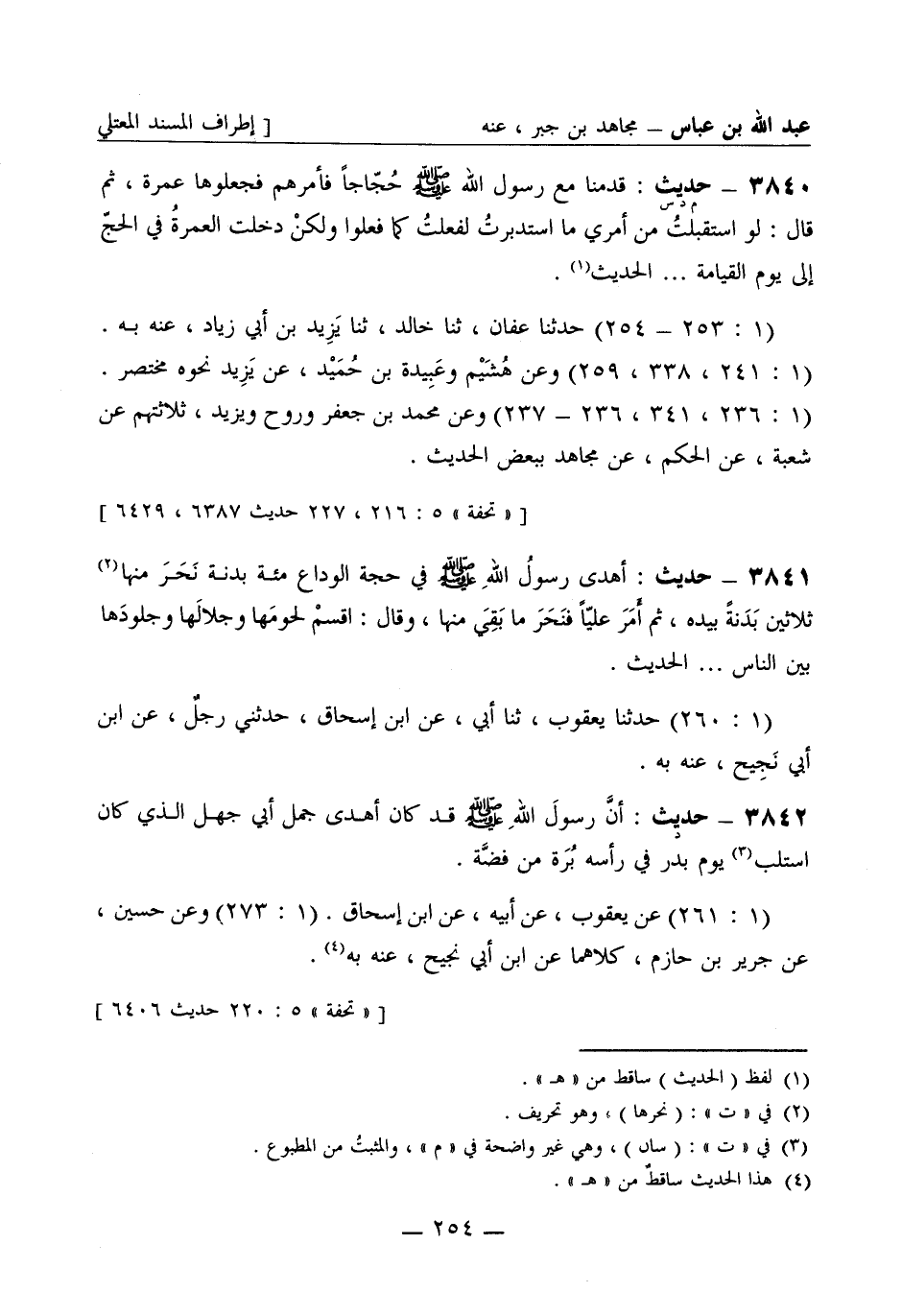 3839 -[م د س] حديث: قدمنا مع رسول الله صَلَّى اللَّهُ عَلَيْهِ وَسَلَّمَ حُجّاجاً فأمرهم فجعلوها عُمْرة، ثم قال: لو استقبلتُ من أمري ما استدبرتُ لفعلتُ كما فعلوا ولكن دخلت العُمْرةُ في الحجّ إلى يوم القيامة ... الحديث. (1: 253 - 254) حَدَّثَنا عفان ثنا خالد ثنا يزيد بن أبي زياد، عنه به. (1: 241، 338، 259) وعن هُشَيم وعَبِيدة بن حُمَيد، عن يزيد نحوه مختصر. (1: 236، 341، 236 - 237) وعن محمد بن جعفر ورَوْح ويزيد، ثلاثتهم عن شُعبة عن الحكم عن مجاهد ببعض الحديث.