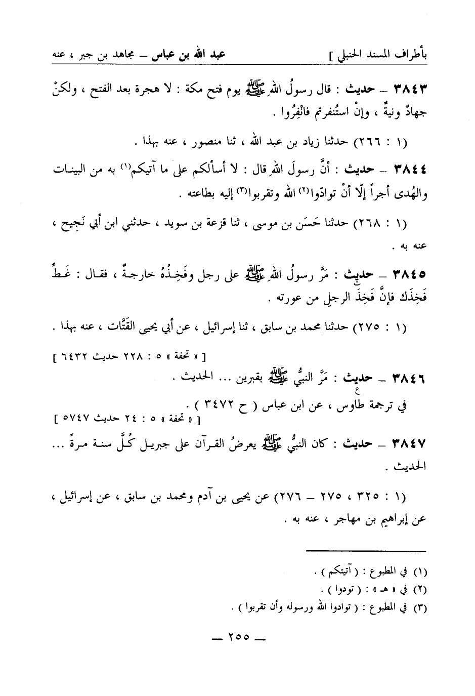3846 - حديث: كان النبيُّ صَلَّى اللَّهُ عَلَيْهِ وَسَلَّمَ يعرضُ القرآن على جبريل كُلَّ سنة مرة ... الحديث. (1: 325، 275 - 276) عن يحيى بن آدم ومحمد بن سابق، عن إسرائيل، عن إبراهيم بن مهاجر، عنه -[256]- به.