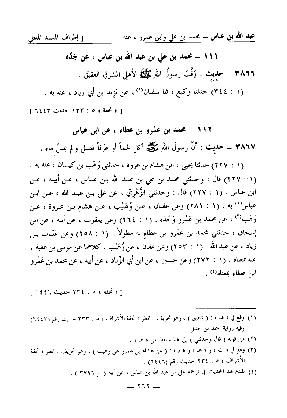 3866 -[م] حديث: أنَّ رسولَ الله صَلَّى اللَّهُ عَلَيْهِ وَسَلَّمَ أكل لحماً أو عَرْقاً فصَلّى ولم يمسَّ ماء. (1: 227) حَدَّثَنا يحيى عن هشام بن عروة حَدَّثَني وَهْب بن كَيْسان عنه به. (1: 227) قال: وحَدَّثَني محمد بن علي بن عبد الله بن عباس، عن أبيه، عن ابن عباس. (1: 227) قال: وحَدَّثَني الزُّهْرِيُّ عن علي بن عبد الله، عن ابن عباس به. (1: 281) وعن عفان عن وُهَيْب عن هشام بن عروة عن وَهْب، عن محمد بن عمرو وحده. (1: 264) وعن يعقوب، عن أبيه، عن ابن إسحاق، حَدَّثَني محمد بن عمرو بن عطاءٍ به مطولاً. (1: 258) وعن عَتَّاب بن زياد، عن عبد الله. (1: 253) وعن عفان عن وُهَيْب كلاهما عن موسى بن عقبة، عنه بمعناه. (1: 272) وعن حُسَين عن ابن أبي الزِّناد، عن أبيه عن محمد بن عمرو بن عطاء. بمعناه.