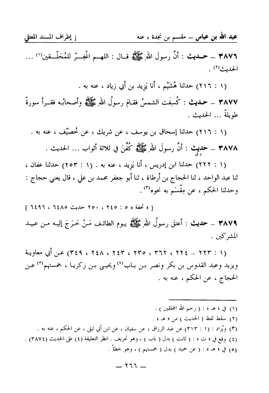 3879 - حديث: أعتقَ رسولُ الله صَلَّى اللَّهُ عَلَيْهِ وَسَلَّمَ يوم الطائف من خَرَجَ إليه من عبيد المشركين. (1: 223 - 224، 362، 235، 243، 248، 349) عن أبي معاوية ويزيد وعبد القدوس بن بكر ونَصْر بن باب ويحيى بن زكريا خمستهم عن الحجاج عن الحكم عنه -[267]- به.