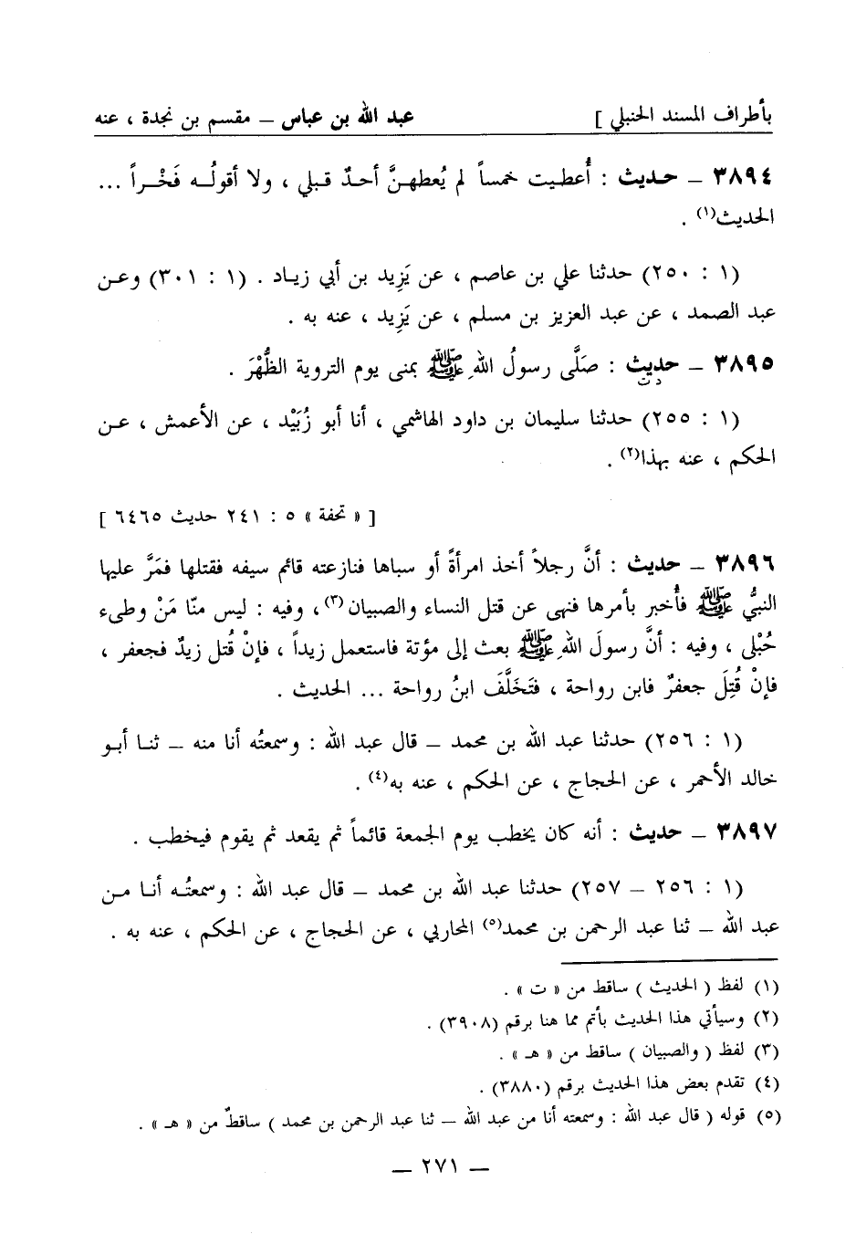 3896 - حديث: أنَّ رجلاً أخذ امرأةً أو سباها فنازعته قائم سيفه فقتلها فمَرَّ عليها النبيُّ صَلَّى اللَّهُ عَلَيْهِ وَسَلَّمَ فأُخبر بأمرها فنَهَى عن قتل النِّساء والصبيان وفيه: ليس منّا مَنْ وطئ حُبْلى وفيه أنَّ رسولَ الله صَلَّى اللَّهُ عَلَيْهِ وَسَلَّمَ بعث إلى مؤتة فاستعمل زيداً، فإنْ قُتِل زيدٌ فجعفر، فإنْ قُتِل جعفرٌ فابن رَوَاحة فتخَلَّفَ ابن رَوَاحة ... الحديث. (1: 256) حَدَّثَنا عبد الله بن محمد - قال عبد الله: وسمعتُه أنا منه - ثنا أبو خالد الأحمر عن الحجاج عن الحكم عنه به.