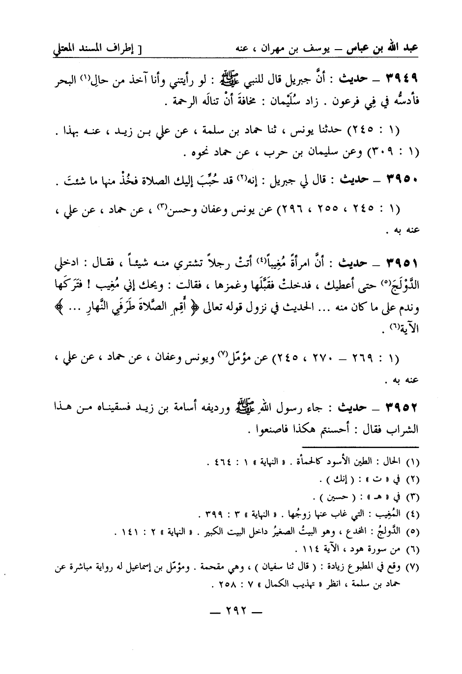 3950 - حديث: أنَّ امرأةً مُغِيباً أتت رجلاً تشتري منه شيئاً فقال: ادخلي الدَّوْلَجَ حتى أعطيك، فدخلت فقَبَّلَها وغمزها فقالت: ويحك إني مُغِيب! فتَرَكَها وندم على ما كان منه ... الحديث في نزول قوله تعالى أَقِمِ الصَّلاةَ طَرَفَي النَّهار ... الآية. (1: 269 - 270، 245) عن مُؤمّل ويونس وعفان عن حمّاد عن علي عنه به.