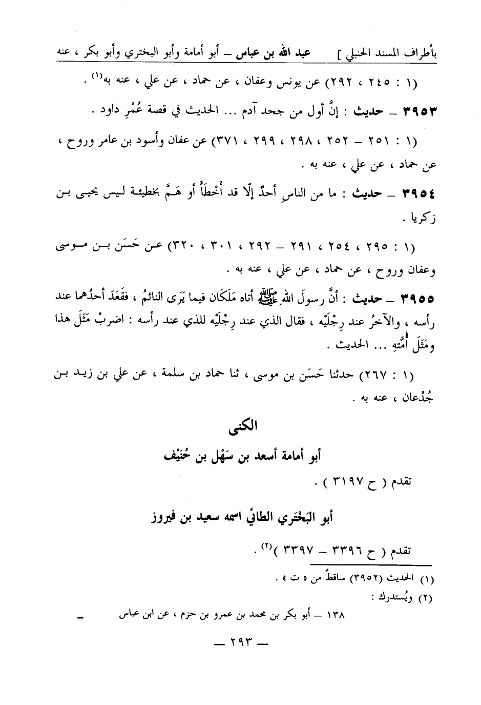 3953 - حديث: ما من الناس أحدٌ إلا قد أَخْطَأَ أو هَمَّ بخطيئة ليس يحيى بن زكريا. (1: 295، 254، 291 - 292، 301، 320) عن حَسَن بن موسى وعفان ورَوْح عن حمّاد عن علي عنه به.