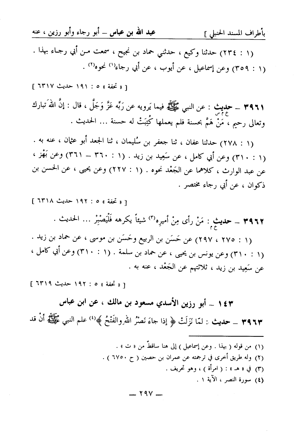 3960 -[خ م س] حديث: عن النبيّ صَلَّى اللَّهُ عَلَيْهِ وَسَلَّمَ فيما يَرويه عن رَبِّه عَزَّ وجَلَّ قال: إنَّ الله تبارك وتعالى رحيم، من هَمَّ بحسنة فلم يعملها كُتِبَتْ له حسنة ... الحديث. (1: 278) حَدَّثَنا عفان ثنا جعفر بن سليمان ثنا الجَعْد أبو عثمان عنه به. (1: 310) وعن أبي كامل عن سعيد بن زيد (1: 360 - 361) وعن بَهْز عن عبد الوارث كلاهما عن الجَعْد نحوه. (1: 227) وعن يحيى عن الحَسَن بن ذَكْوان عن أبي رجاء مختصر.