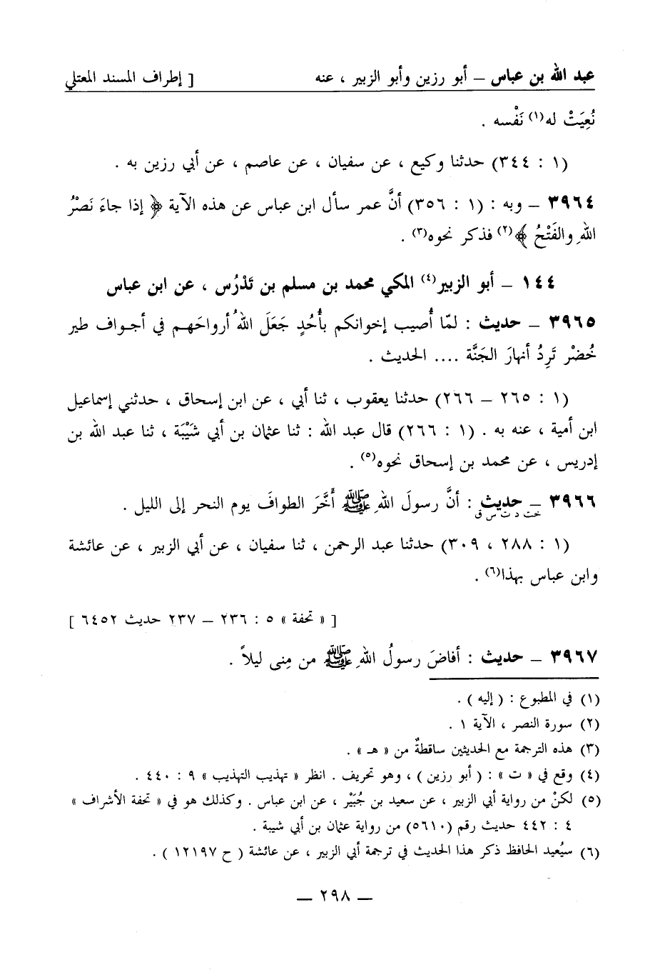 3965 -[خت د ت س ق] حديث: أنَّ رسولَ الله صَلَّى اللَّهُ عَلَيْهِ وَسَلَّمَ أخَّرَ الطوافَ يوم النَّحْر إلى الليل. (1: 288، 309) حَدَّثَنا عبد الرحمن ثنا سفيان عن أبي الزُّبَير، عن عائشة وابن عباس بهذا.