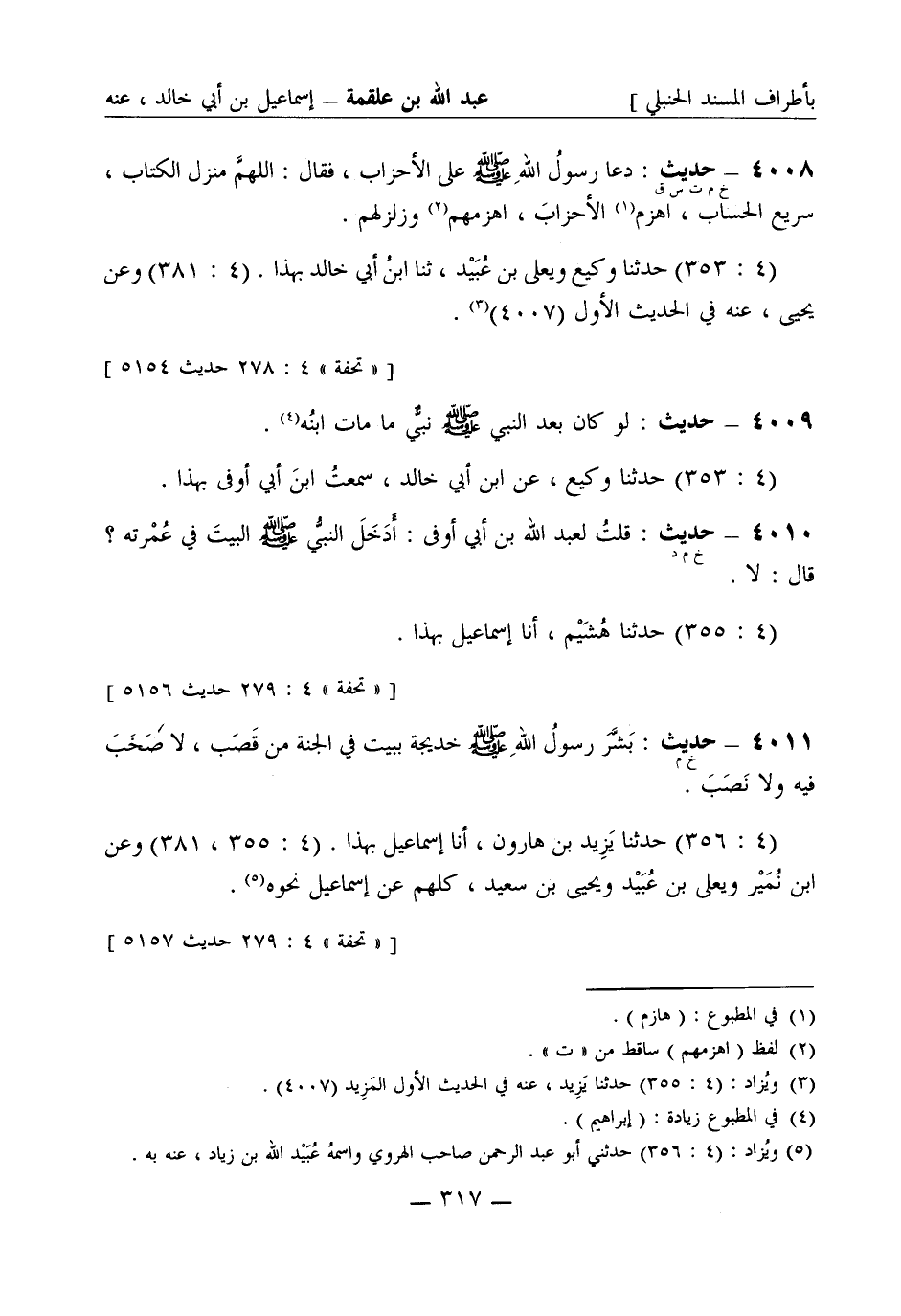 4008 -[خ م ت س ق] حديث: دعا رسولُ الله صَلَّى اللَّهُ عَلَيْهِ وَسَلَّمَ على الأحزاب فقال: اللهمَّ منزل الكتاب سريع الحساب اهزم الأحزاب اهزمهم وزلزلهم. (4: 353) حَدَّثَنا وكيع ويَعْلَى بن عُبَيد، ثنا ابن أبي خالد بهذا. (4: 381) وعن يحيى عنه في الحديث الأول (4007) .