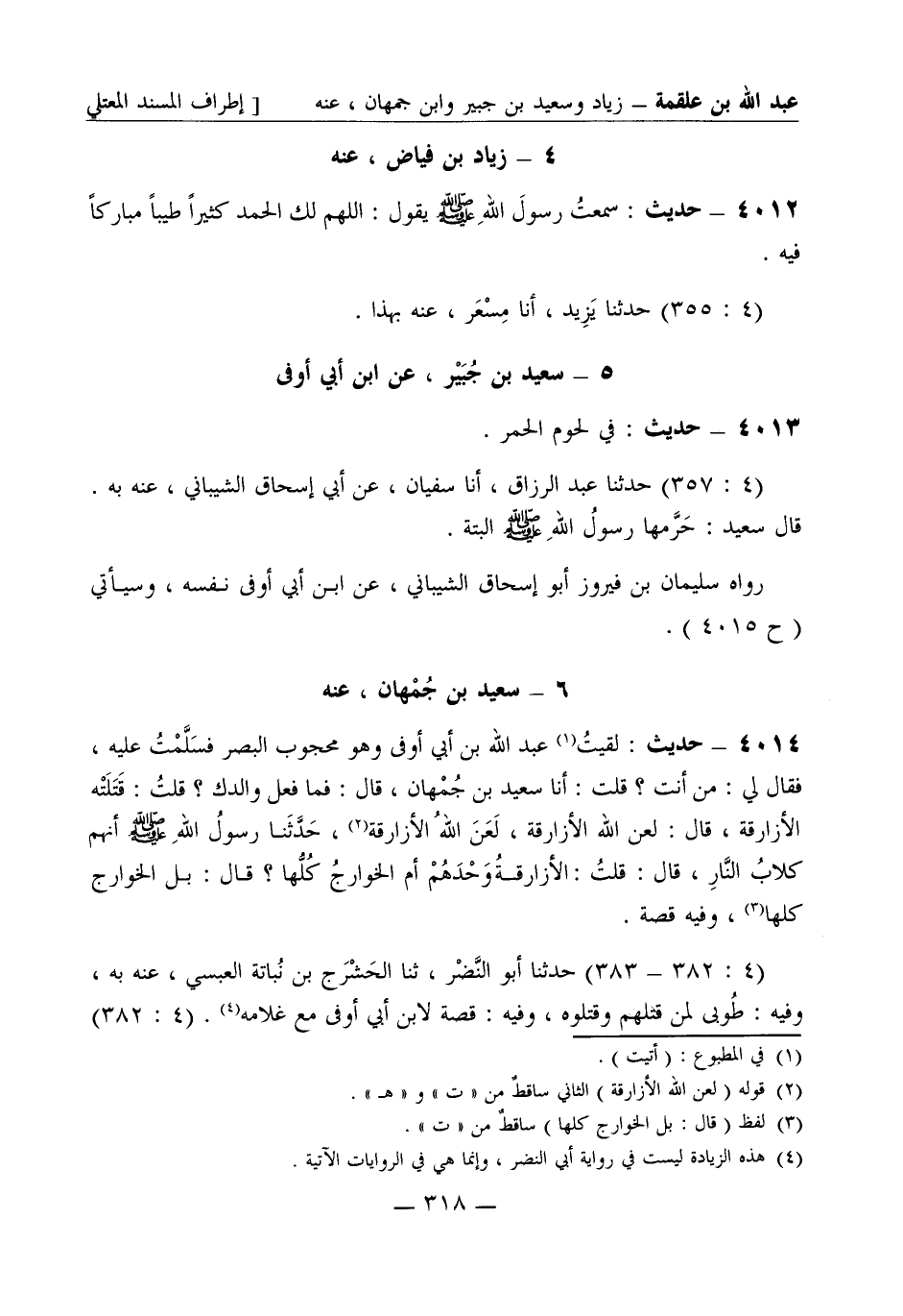 4014 - حديث: لقيتُ عبد الله بن أبي أوفى وهو محجوب البصر فسَلَّمْتُ عليه، فقال لي: من أنت؟ قلت: أنا سعيد بن جُمْهان، قال: فما فعل والدك؟ قلت: قَتَلَتْه الأزارقة، قال: لَعَنَ الله الأزارقة، لَعَنَ الله الأزارقة، حَدَّثَنا رسولُ الله صَلَّى اللَّهُ عَلَيْهِ وَسَلَّمَ أنهم كلابُ النَّار، قال قلت الأزارقة وَحْدَهُمْ أم الخوارجُ كُلُّها؟ قال: بل الخوارج كُلّها وفيه قصة. (4: 382 - 383) حَدَّثَنا أبو النَّضْر ثنا الحَشْرَج بن نُباتة العَبْسي عنه به وفيه طُوبى لمن قتلهم وقتلوه وفيه قصة لابن أبي أوفى مع غلامه -[319]-. (4: 382) حَدَّثَنا عفان وبَهْز المعنى قالا: ثنا حمّاد يعني ابن سَلَمة، عنه به. (4: 357) وأفرده عن عفان وَحْدَه.