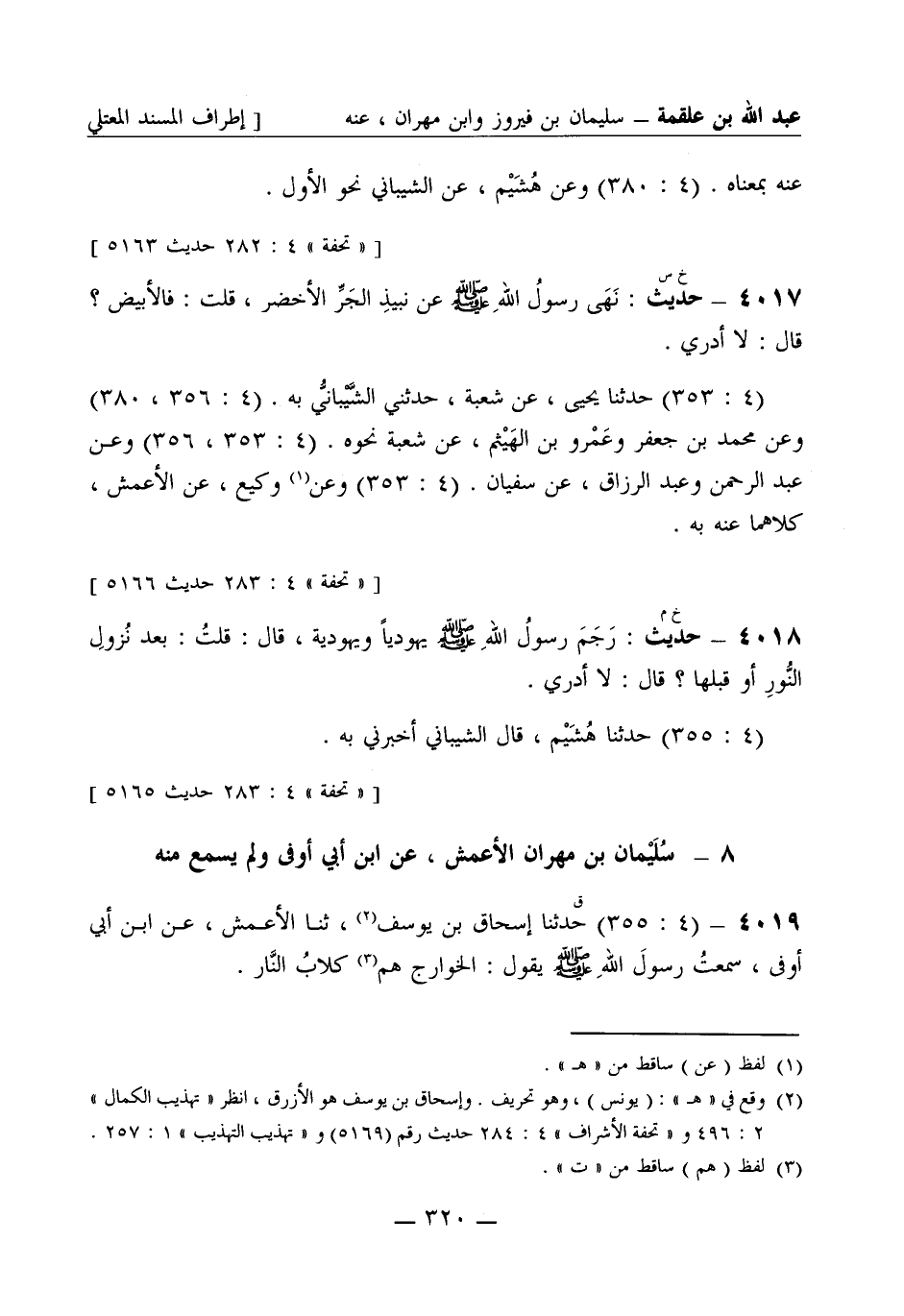4018 -[خ م] حديث: رَجَمَ رسولُ الله صَلَّى اللَّهُ عَلَيْهِ وَسَلَّمَ يهودياً ويهودية، قال قلت بعد نزول النُّورِ أو قبلها؟ قال لا أدري. (4: 355) حَدَّثَنا هُشَيْم قال الشَّيْبَانِيُّ أخبرني به.