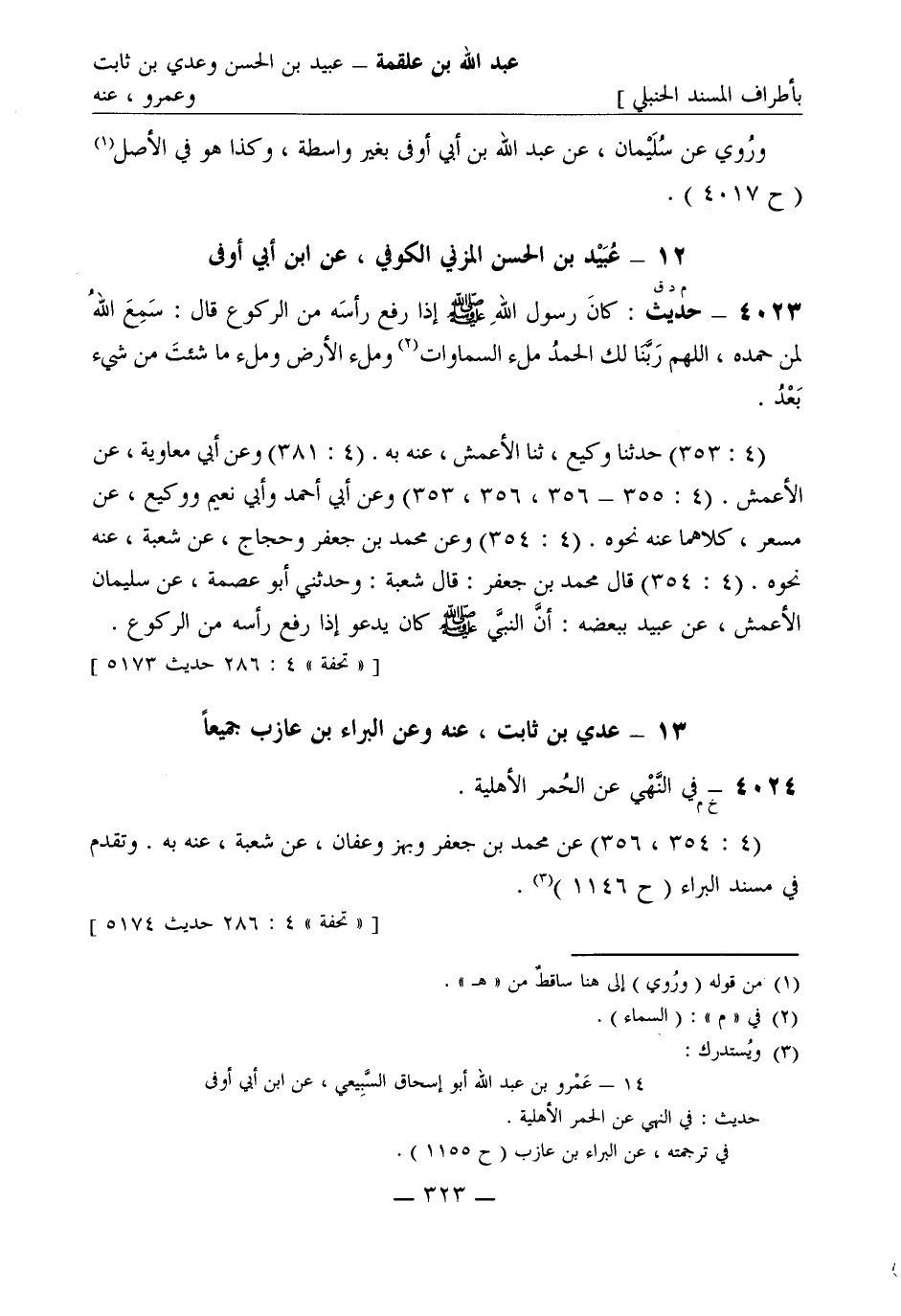 4023 -[م د ق] حديث: كان رسولُ الله صَلَّى اللَّهُ عَلَيْهِ وَسَلَّمَ إذا رفع رأسَه من الركوع قال: سَمِعَ اللهُ لمن حمده اللهمَّ رَبَّنا لك الحمدُ مِلَءُ السماوات ومِلَءُ الأرض ومِلَءُ ما شئتَ من شيء بعد. (4: 353) حَدَّثَنا وكيع ثنا الأعمش عنه به. (4: 381) وعن أبي معاوية عن الأعمش (4: 355 - 356، 356، 353) وعن أبي أحمد وأبي نعيم ووكيع، عن مِسْعَر كلاهما عنه نحوه. (4: 354) وعن محمد بن جعفر وحجاج، عن شُعبة عنه نحوه. (4: 354) قال محمد بن جعفر قال شُعبة: وحَدَّثَني أبو عصمة عن سليمان الأعمش عن عُبَيد ببعضه: أنَّ النبيَّ صَلَّى اللَّهُ عَلَيْهِ وَسَلَّمَ كان يدعو إذا رفع رأسه من الركوع.