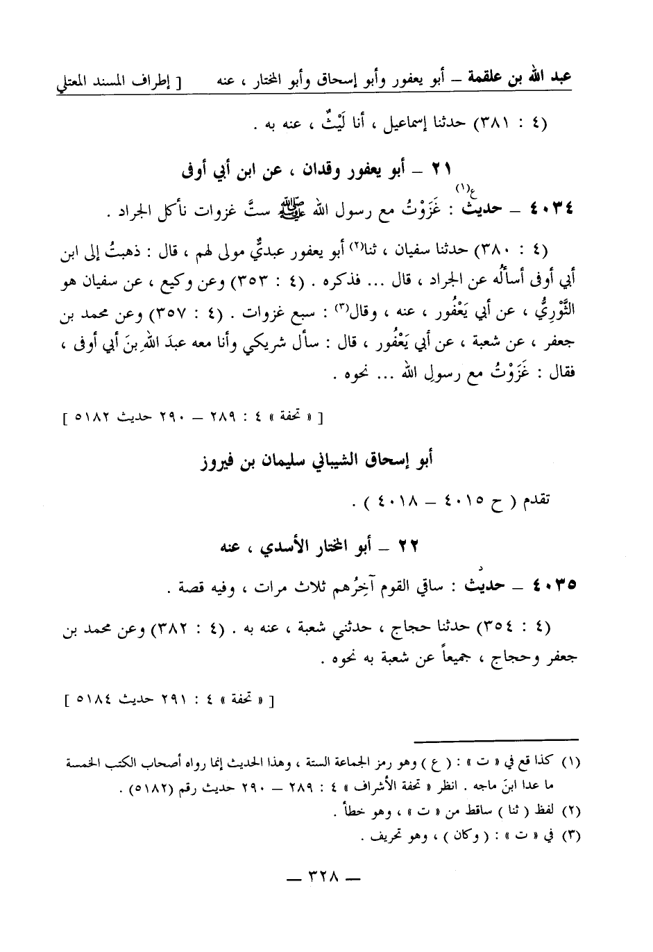4034 -[ع] حديث: غَزَوْتُ مع رسول الله صَلَّى اللَّهُ عَلَيْهِ وَسَلَّمَ ستَّ غزوات نأكل الجراد. (4: 380) حَدَّثَنا سفيان ثنا أبو يَعْفُور عبديٌّ مولى لهم، قال: ذهبتُ إلى ابن أبي أوفى أسألُه عن الجراد، قال ... فذكره. (4: 353) وعن وكيع عن سفيان هو الثَّوْرِيُّ، عن أبي يَعْفُور عنه وقال سبع غزوات. (4: 357) وعن محمد بن جعفر عن شُعبة، عن أبي يَعْفُور، قال: سأل شريكي وأنا معه عبد الله بن أبي أوفى، فقال: غَزَوْتُ مع رسول الله ... نحوه.