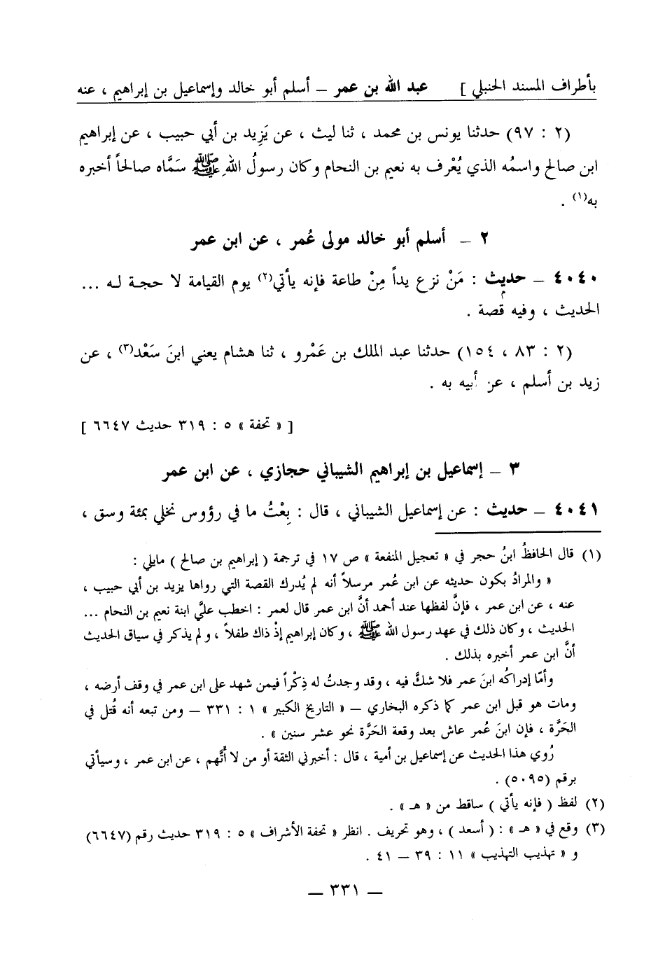 4040 -[م] حديث: من نزع يداً من طاعة فإنه يأتي يوم القيامة لا حجة له ... الحديث وفيه قصة. (2: 83، 154) حَدَّثَنا عبد الملك بن عمرو ثنا هشام يعني ابن سعد، عن زيد بن أسلم، عن أبيه به.