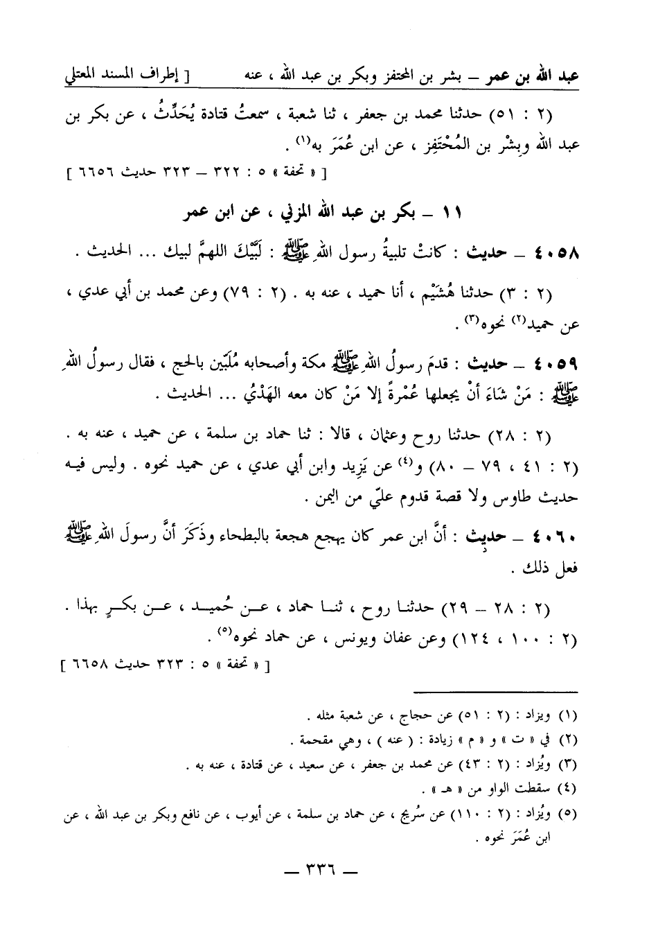 4058 - حديث: كانت تلبيةُ رسول الله صَلَّى اللَّهُ عَلَيْهِ وَسَلَّمَ: لَبَّيْكَ اللهمَّ لَبَّيْك ... الحديث. (2: 3) حَدَّثَنا هُشَيْم أنا حُمَيد عنه به. (2: 79) وعن محمد بن أبي عدي، عن حُمَيد نحوه.