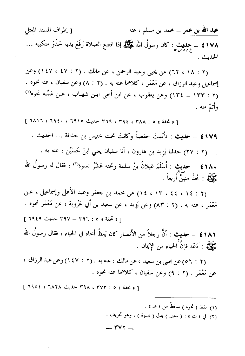 4178 -[خ م د س ق] كان رسولُ الله صَلَّى اللَّهُ عَلَيْهِ وَسَلَّمَ إذا افتتح الصلاة رَفَعَ يديه حَدْوَ منكبيه ... الحديث. (2: 18، 62) عن يحيى وعبد الرحمن، عن مالك. (2: 47، 147) وعن إسماعيل وعبد الرزاق، عن مَعْمَر، كلاهما عنه به. (2: 8) وعن سفيان عنه نحوه. (2: 133 - 134) وعن يعقوب عن ابن أخي ابن شهاب، عن عَمِّه نحوه وأتمّ منه.