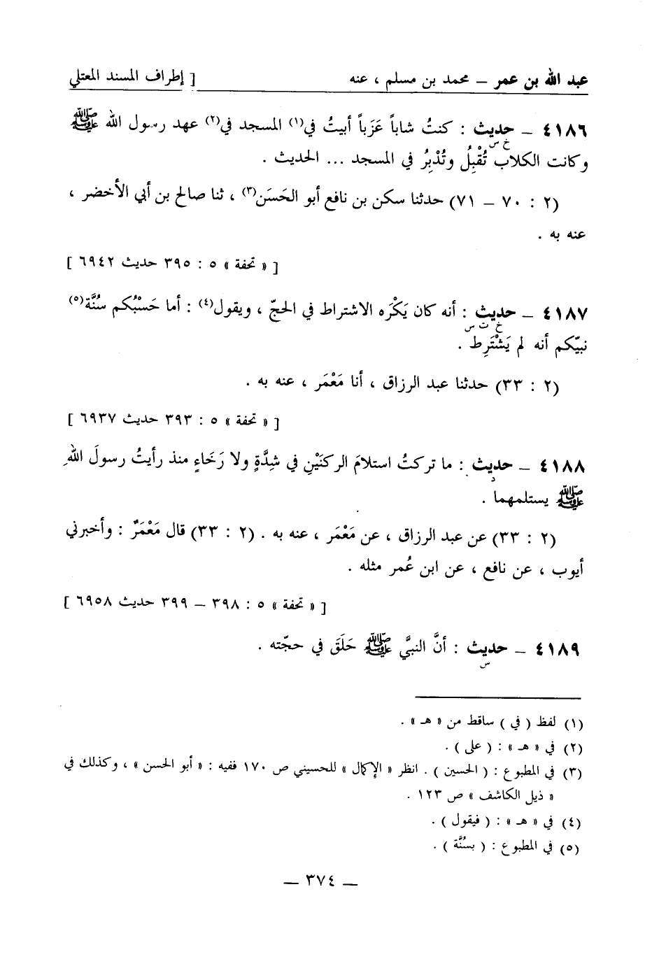 4189 -[س] حديث: أنَّ النبيَّ صَلَّى اللَّهُ عَلَيْهِ وَسَلَّمَ حَلَقَ في حجّته -[375]-. (2: 33، 89) عن عبد الرزاق بن همام، عن مَعْمَر عنه به. (2: 33) قال مَعْمَرٌ: وعن أيوب عن نافع، عن ابن عمر مثله.