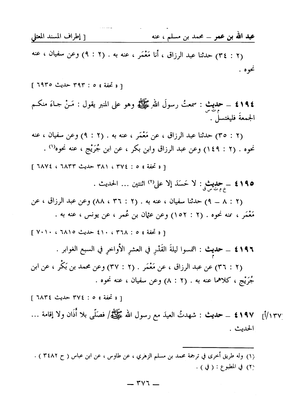 4195 -[خ م ت س ق] حديث: لا حَسَدَ إلا على اثنتين ... الحديث. (2: 8 - 9) حَدَّثَنا سفيان، عنه به. (2: 36، 88) وعن عبد الرزاق، عن مَعْمَر عنه نحوه. (2: 152) وعن عثمان بن عمر، عن يونس، عنه به.