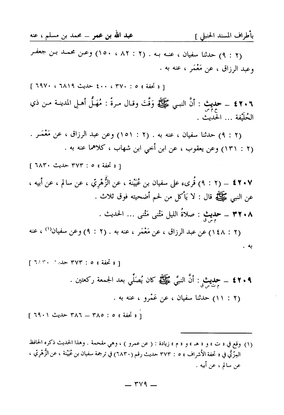 4206 -[خ م س] حديث: أنَّ النبيَّ صَلَّى اللَّهُ عَلَيْهِ وَسَلَّمَ وَقَّتَ وقال مرةً: مُهَلُّ أهلِ المدينة من ذي الحُلَيْفة ... الحديث. (2: 9) حَدَّثَنا سفيان، عنه به. (2: 151) وعن عبد الرزاق، عن مَعْمَر، (2: 131) وعن يعقوب عن ابن أخي ابن شهاب، كلاهما عنه به.