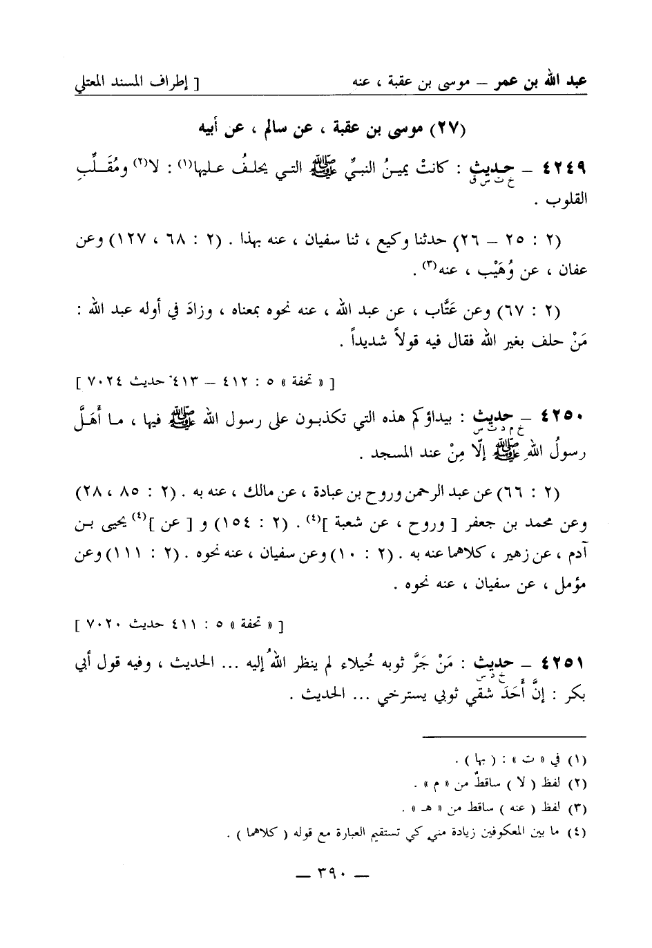 4249 -[خ ت س ق] حديث: كانت يمينُ النبيِّ صَلَّى اللَّهُ عَلَيْهِ وَسَلَّمَ التي يحلفُ عليها: لا ومُقَلِّب القلوب. (2: 25 - 26) حَدَّثَنا وكيع ثنا سفيان عنه بهذا. (2: 68، 127) وعن عفان عن وُهَيْب، عنه. (2: 67) وعن عَتَّاب عن عبد الله عنه نحوه بمعناه وزاد في أوله عبد الله: من حلف بغير الله فقال فيه قولاً شديداً.