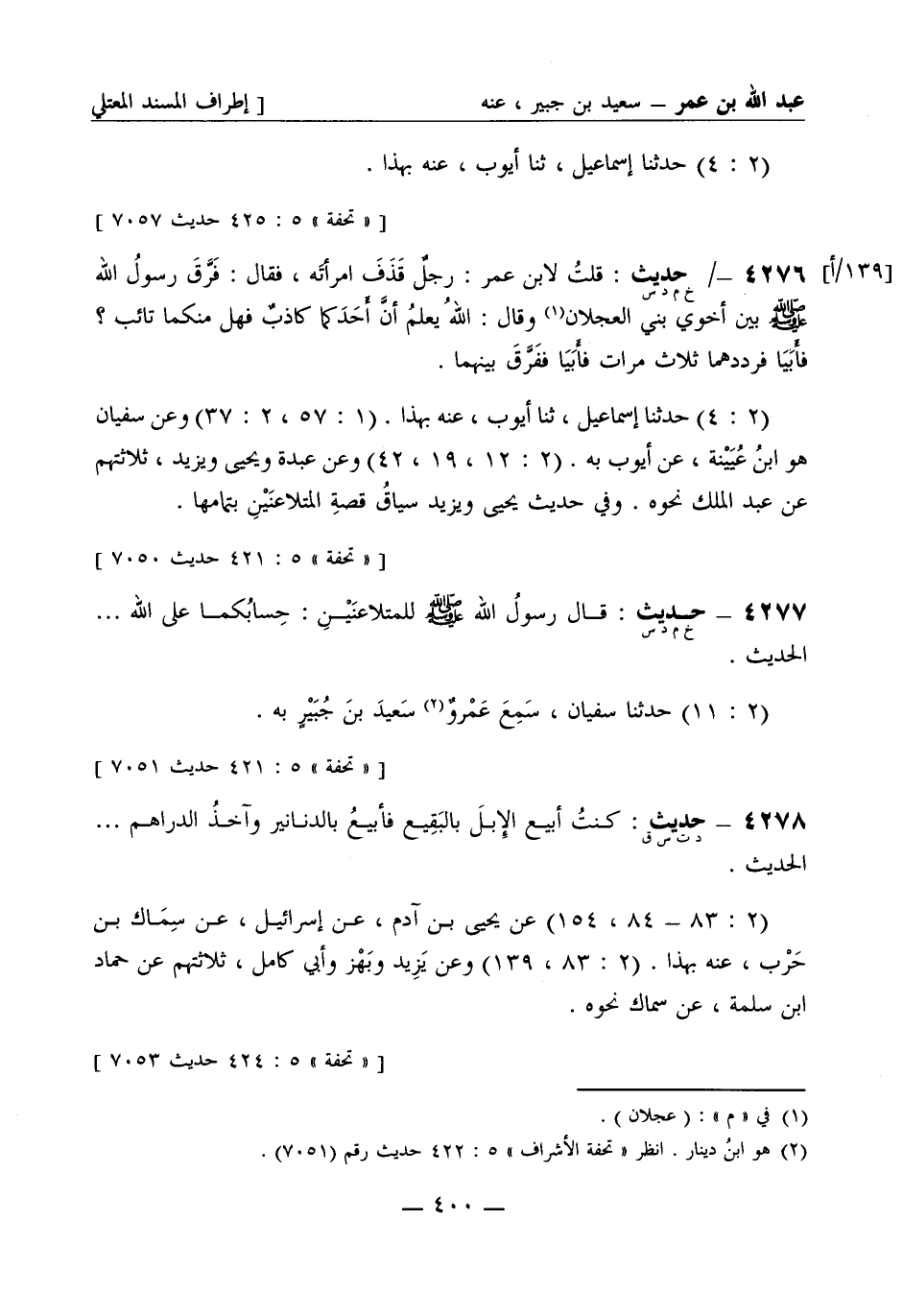 4276 -[خ م د س] حديث: قلت لابن عمر: رجلٌ قَذَفَ امرأتَه فقال: فَرَّقَ رسولُ الله صَلَّى اللَّهُ عَلَيْهِ وَسَلَّمَ بين أخوي بني العَجْلان، وقال: اللهُ يعلمُ أنَّ أَحَدَكما كاذبٌ فهل منكما تائب؟ فأَبَيَا فرددهما ثلاث مرات فأَبَيَا ففَرَّقَ بينهما. (2: 4) حَدَّثَنا إسماعيل، ثنا أيوب، عنه بهذا. (1: 57، 2: 37) وعن سفيان هو ابن عُيَينة، عن أيوب به. (2: 12، 19، 42) وعن عبدة ويحيى ويزيد، ثلاثتهم عن عبد الملك نحوه. وفي حديث يحيى ويزيد سياقُ قصةِ المتلاعنَيْن بتمامها.