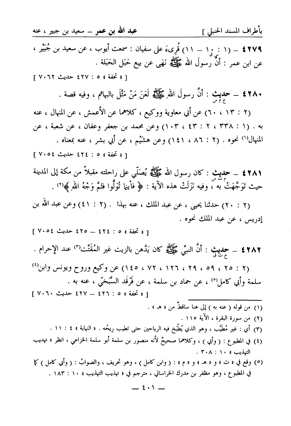 4279 - (1: 10 - 11) قُرِئَ على سفيان سمعت أيوب عن سعيد بن جُبَير، عن ابن عمر: أنَّ رسولَ الله صَلَّى اللَّهُ عَلَيْهِ وَسَلَّمَ نَهَى عن بيع حَبَل الحَبَلة.