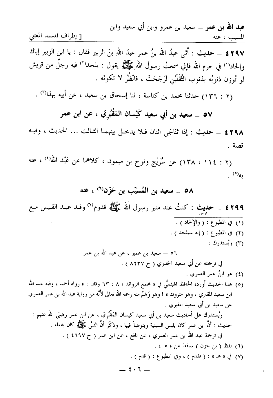 4297 - حديث: أَتَى عبد الله بن عمر عبد الله بن الزُّبَير فقال: يا ابن الزُّبَير إياك وإلحاد في حرم الله فإني سمعتُ رسولَ الله صَلَّى اللَّهُ عَلَيْهِ وَسَلَّمَ يقول: يلحد فيه رجلٌ من قُرَيش لو تُوزن ذنوبُه بذنوب الثَّقَلَيْنِ لرَجَحَتْ، فانْظُرْ لا تكونَه. (2: 136) حَدَّثَنا محمد بن كناسة، ثنا إسحاق بن سعيد، عن أبيه بهذا.