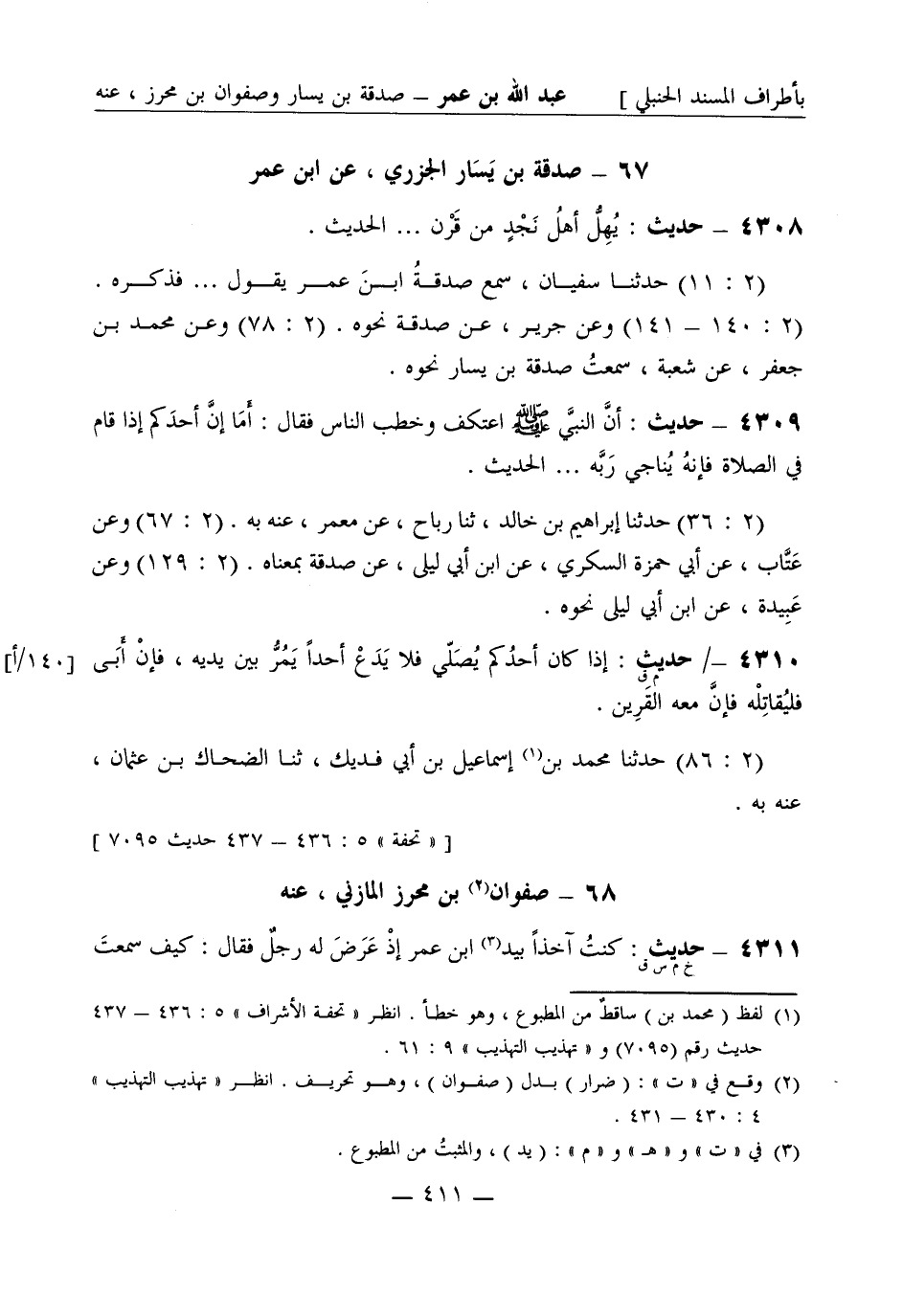 4311 -[خ م س ق] حديث: كنتُ آخذاً بيد ابن عمر إذْ عَرَضَ له رجلٌ فقال: كيف سمعت -[412]- رسول الله صَلَّى اللَّهُ عَلَيْهِ وَسَلَّمَ يقول في النجوى يوم القيامة؟ قال: سمعتُ رسولَ الله صَلَّى اللَّهُ عَلَيْهِ وَسَلَّمَ يقول: إنَّ الله يُدني المؤمن فيضع عليه كنفه ... الحديث. (2: 74) حَدَّثَنا بَهْز وعفان، قالا: ثنا همام، عن قَتَادة، عنه به. (2: 105) وعن عبد الوهاب بن عطاء عن سعيد عن قَتَادة نحوه.
