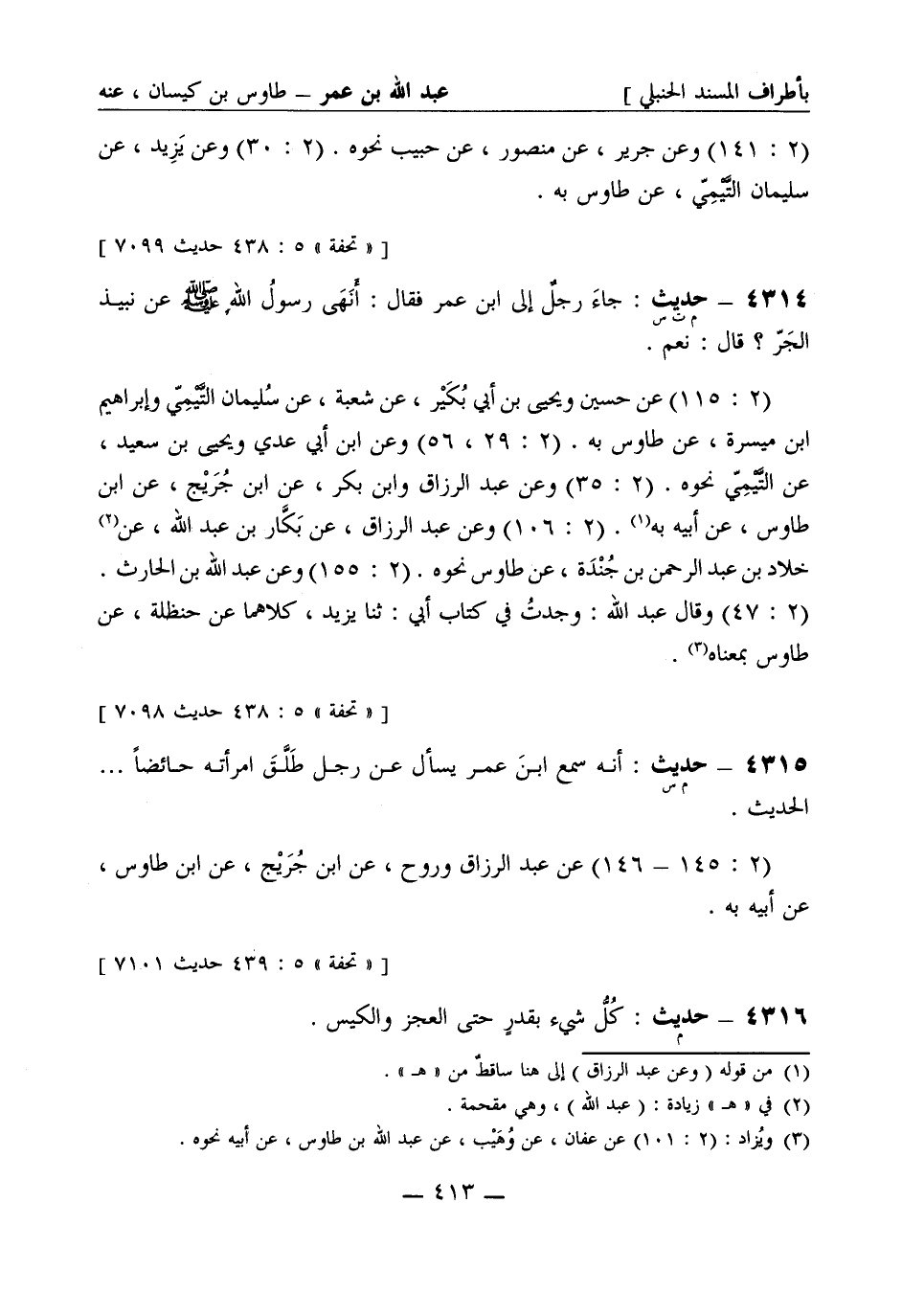 4314 -[م ت س] حديث: جاءَ رجلٌ إلى ابن عمر فقال: أَنَهَى رسولُ الله صَلَّى اللَّهُ عَلَيْهِ وَسَلَّمَ عن نبيذ الجَرّ؟ قال: نعم. (2: 115) عن حُسَين ويحيى بن أبي بُكَيْر، عن شُعبة، عن سليمان التَّيْمِيّ وإبراهيم بن ميسرة، عن طاوس به. (2: 29، 56) وعن ابن أبي عدي ويحيى بن سعيد عن التَّيْمِيّ نحوه. (2: 35) وعن عبد الرزاق وابن بكر، عن ابن جُرَيج، عن ابن طاوس، عن أبيه به. (2: 106) وعن عبد الرزاق عن بَكَّار بن عبد الله عن خلاد بن عبد الرحمن بن جُنْدَة، عن طاوس نحوه. (2: 155) وعن عبد الله بن الحارث. (2: 47) وقال عبد الله: وجدتُ في كتاب أبي: ثنا يزيد كلاهما عن حنظلة عن طاوس بمعناه.