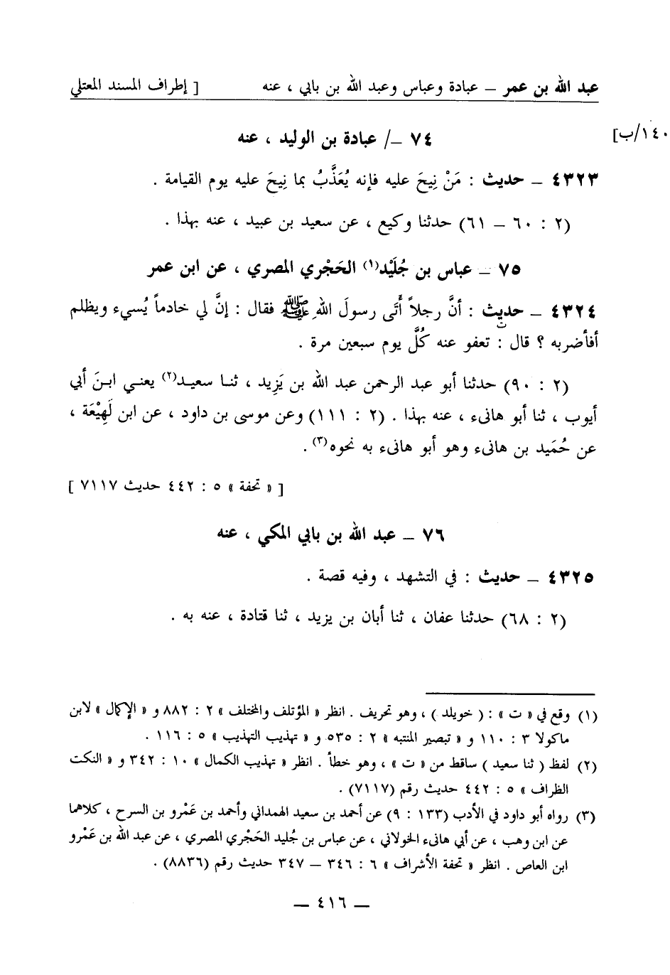 4324 -[ت] حديث: أنَّ رجلاً أَتَى رسولَ الله صَلَّى اللَّهُ عَلَيْهِ وَسَلَّمَ فقال: إنَّ لي خادماً يُسيء ويظلم أفأضربه؟ قال: تعفو عنه كُلَّ يوم سبعين مرة. (2: 90) حَدَّثَنا أبو عبد الرحمن عبد الله بن يزيد، ثنا سعيد يعني ابن أبي أيوب، ثنا أبو هانئ عنه بهذا. (2: 111) وعن موسى بن داود عن ابن لَهِيْعَة، عن حُمَيد بن هانئ وهو أبو هانئ به نحوه.