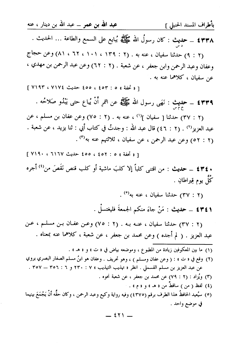 4341 - حديث: من جاءَ منكم الجمعةَ فليغتسل. (2: 37) حَدَّثَنا سفيان عنه به. (2: 75) وعن عفان بن مسلم، عن عبد العزيز. (لم أجده) وعن محمد بن جعفر، عن شُعبة، كلاهما عنه -[422]- بمعناه.