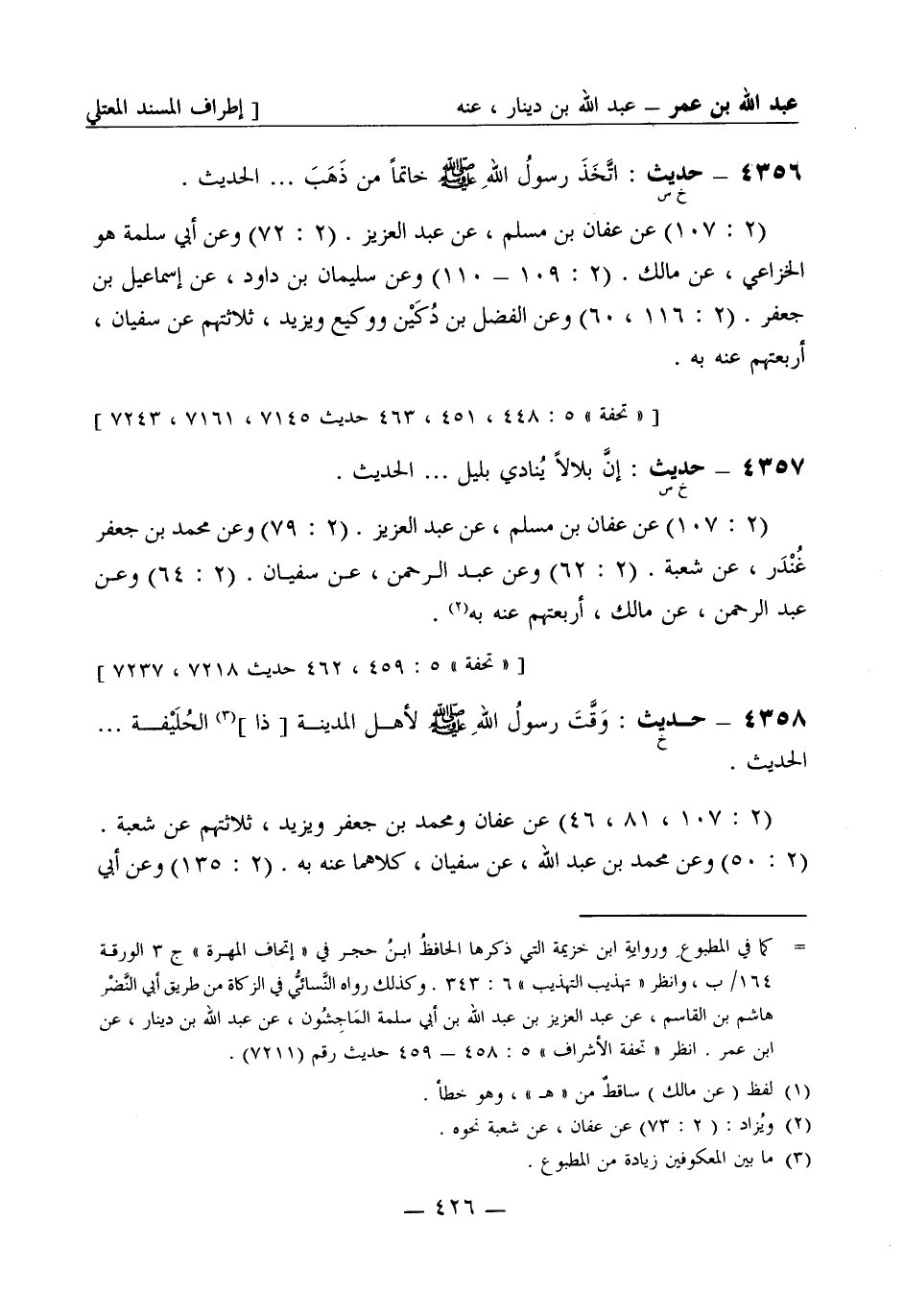 4358 -[خ] حديث: وَقَّتَ رسولُ الله صَلَّى اللَّهُ عَلَيْهِ وَسَلَّمَ لأهل المدينة ذا الحُلَيْفة ... الحديث. (2: 107، 81، 46) عن عفان ومحمد بن جعفر ويزيد، ثلاثتهم عن شُعبة. (2: 50) وعن محمد بن عبد الله، عن سفيان، كلاهما عنه به. (2: 135) وعن أبي -[427]- نعيم، عن سفيان بقصة يَلَمْلَم مختصر.