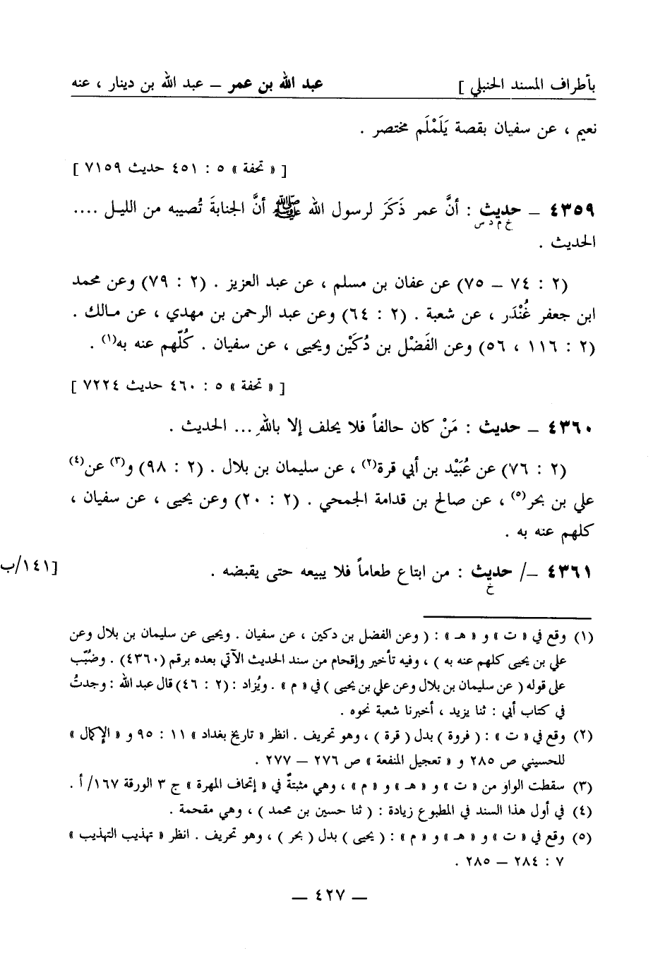 4359 -[خ م د س] حديث: أنَّ عمر ذَكَرَ لرسول الله صَلَّى اللَّهُ عَلَيْهِ وَسَلَّمَ أنَّ الجنابةَ تُصيبه من الليل ... الحديث. (2: 74 - 75) عن عفان بن مسلم، عن عبد العزيز. (2: 79) وعن محمد بن جعفر غُنْدَر، عن شُعبة. (2: 64) وعن عبد الرحمن بن مهدي، عن مالك. (2: 116، 56) وعن الفَضْل بن دُكَيْن ويحيى، عن سفيان. كُلّهم عنه به.