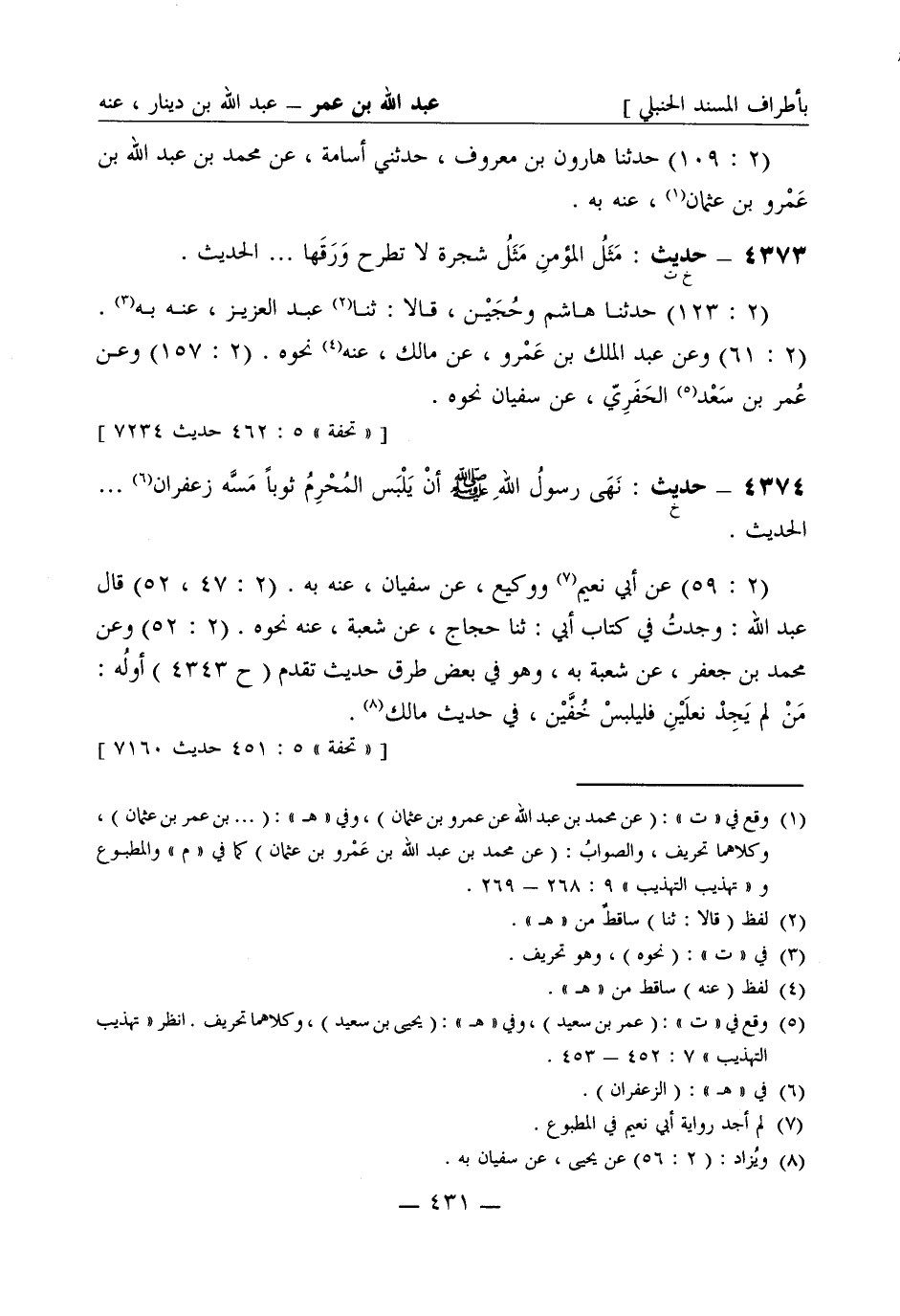 4374 -[خ] حديث: نَهَى رسولُ الله صَلَّى اللَّهُ عَلَيْهِ وَسَلَّمَ أن يَلْبَس المُحْرِمُ ثوباً مَسَّه زَعْفَرَان ... الحديث. (2: 59) عن أبي نعيم ووكيع، عن سفيان، عنه به. (2: 47، 52) قال عبد الله: وجدتُ في كتاب أبي: ثنا حجاج، عن شُعبة، عنه نحوه. (2: 52) وعن محمد بن جعفر، عن شُعبة به، وهو في بعض طرق حديث تقدم (ح 4343) أوله: من لم يَجِدْ نعلَيْنِ فليَلْبس خُفَّيْن، في حديث مالك.