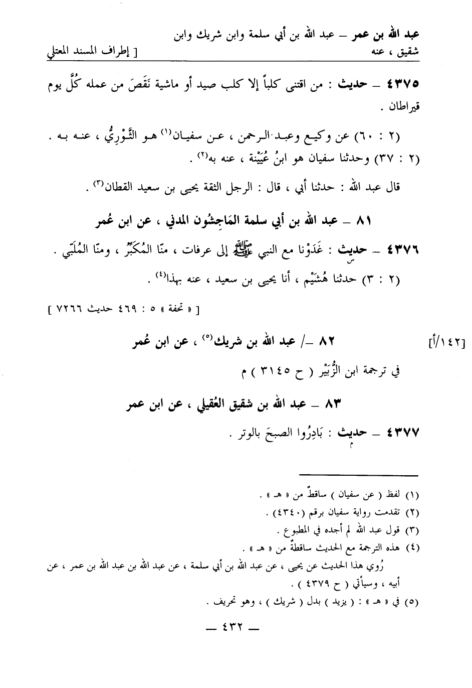 4375 - حديث: من اقتنى كلباً إلا كلب صيد أو ماشية نَقَصَ من عمله كُلَّ يوم قِيراطان. (2: 60) عن وكيع وعبد الرحمن، عن سفيان هو الثَّوْرِيّ، عنه به. (2: 37) وحَدَّثَنا سفيان هو ابن عُيَينة، عنه به. قال عبد الله: حَدَّثَنا أبي قال الرجل الثقة يحيى بن سعيد القطان.