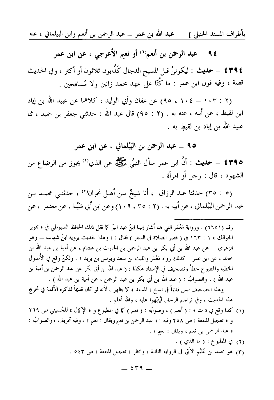 4395 - حديث: أنَّ ابن عمر سأل النبيَّ صَلَّى اللَّهُ عَلَيْهِ وَسَلَّمَ عن الذي يجوز من الرضاع من الشهود قال: رجل أو امرأة. (5: 35) حَدَّثَنا عبد الرزاق، أنا شيخٌ من أهل نجران، حَدَّثَني محمد بن عبد الرحمن البَيْلماني، عن أبيه به. (2: 35، 109) وعن ابن أبي شَيْبَة، عن مُعْتَمِر عن -[440]- محمد بن عُثَيْم عن محمد بن عبد الرحمن نحوه. (2: 35، 109) قال عبد الله: حَدَّثَنا أبو بكر بن أبي شَيْبَة به.