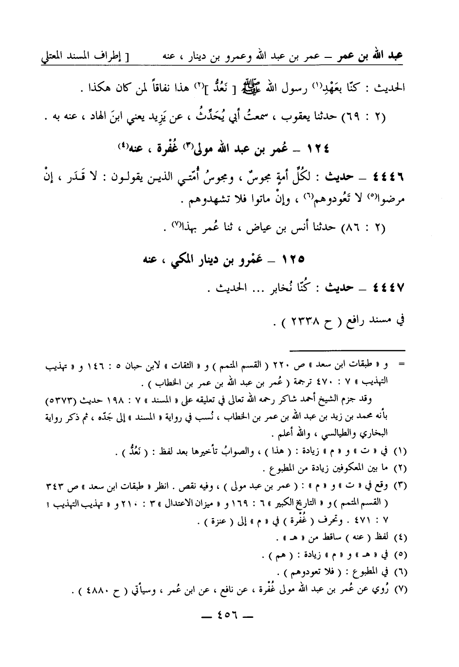 4446 - حديث: لكُلِّ أُمّةٍ مجوسٌ، ومجوسُ أُمّتي الذين يقولون: لا قَدَر، إن مرضوا لا تَعُودوهم وإن ماتوا فلا تشهدوهم. (2: 86) حَدَّثَنا أنس بن عياض، ثنا عمر بهذا.