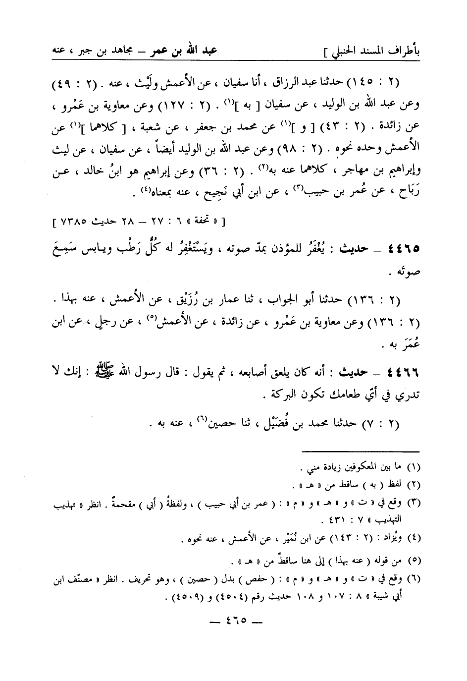 4465 - حديث: يُغْفَرُ للمؤذن بمدّ صوته ويَسْتَغْفِرُ له كُلُّ رَطْب ويابس سَمِعَ صوتَه. (2: 136) حَدَّثَنا أبو الجواب، ثنا عمّار بن رُزَيْق، عن الأعمش، عنه بهذا. (2: 136) وعن معاوية بن عمرو، عن زائدة، عن الأعمش، عن رجلٍ، عن ابن عمر به.