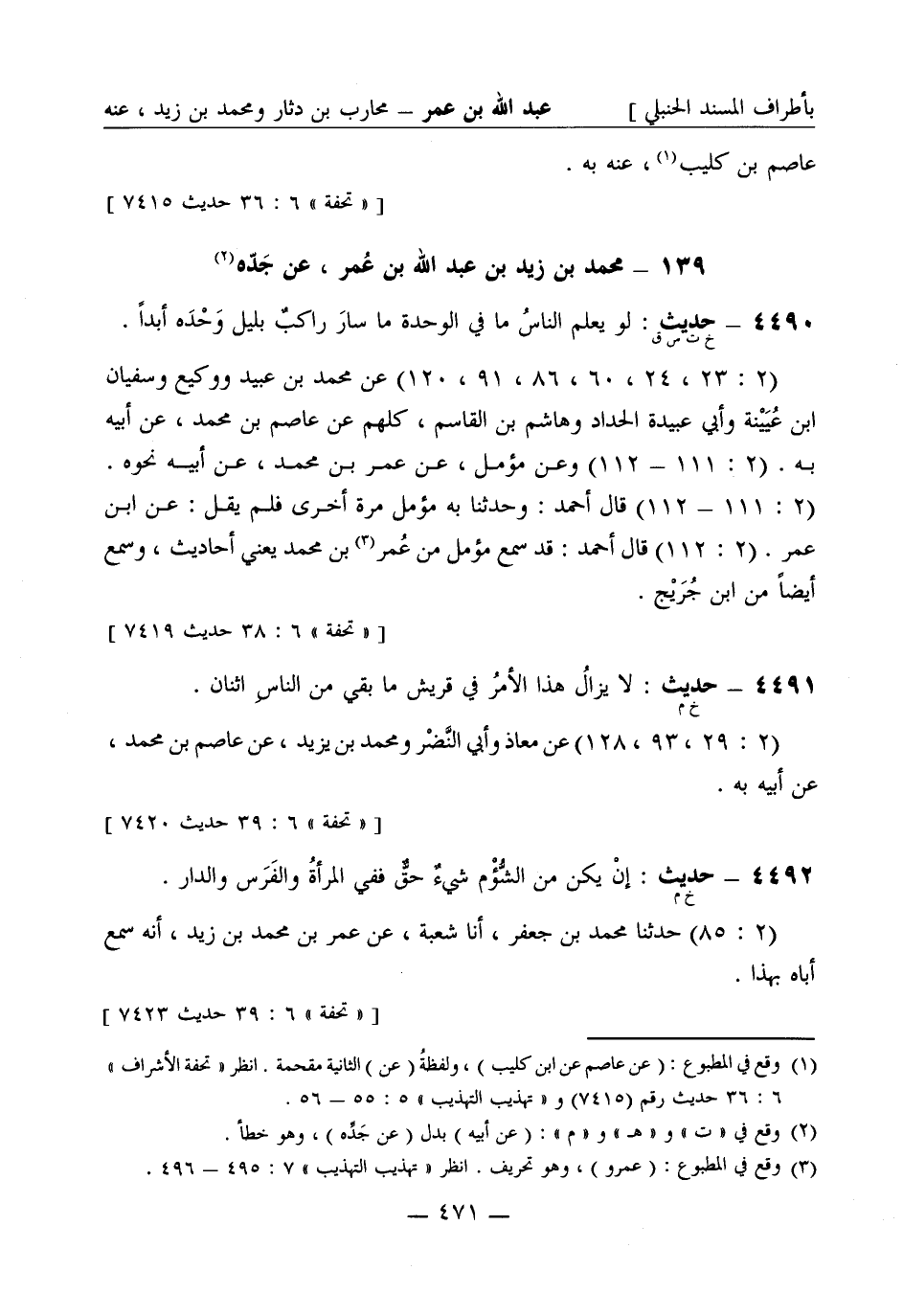 4490 -[خ ت س ق] حديث: لو يعلم الناسُ ما في الوحدة ما سارَ راكبٌ بليل وَحْدَه أبداً. (2: 23، 24، 60، 86، 91، 120) عن محمد بن عُبَيد ووكيع وسفيان بن عُيَينة وأبي عبيدة الحداد وهاشم بن القاسم، كُلّهم عن عاصم بن محمد عن أبيه به. (2: 111 - 112) وعن مُؤمّل عن عمر بن محمد، عن أبيه نحوه. (2: 111 - 112) قال أحمد: وحَدَّثَنا به مُؤمّل مرة أخرى فلم يقل: عن ابن عمر. (2: 112) قال أحمد: قد سمع مُؤمّل من عمر بن محمد يعني أحاديث، وسمع أيضاً من ابن جُرَيج.