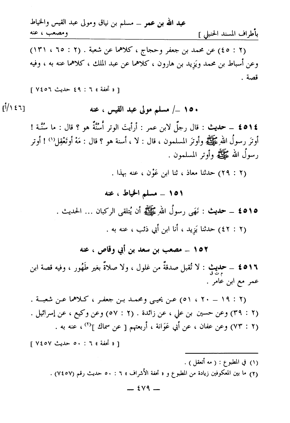 4514 - حديث: قال رجلٌ لابن عمر: أرأيتَ الوتر أسُنَّةٌ هو؟ قال: ما سُنَّة أوترَ رسولُ الله صَلَّى اللَّهُ عَلَيْهِ وَسَلَّمَ وأوترَ المسلمون قال: لا، أسُنَّةٌ هو؟ قال: مَهْ أوتَعْقِل أوترَ رسولُ الله صَلَّى اللَّهُ عَلَيْهِ وَسَلَّمَ وأوترَ المسلمون. (2: 29) حَدَّثَنا معاذ ثنا ابن عَوْن، عنه بهذا.