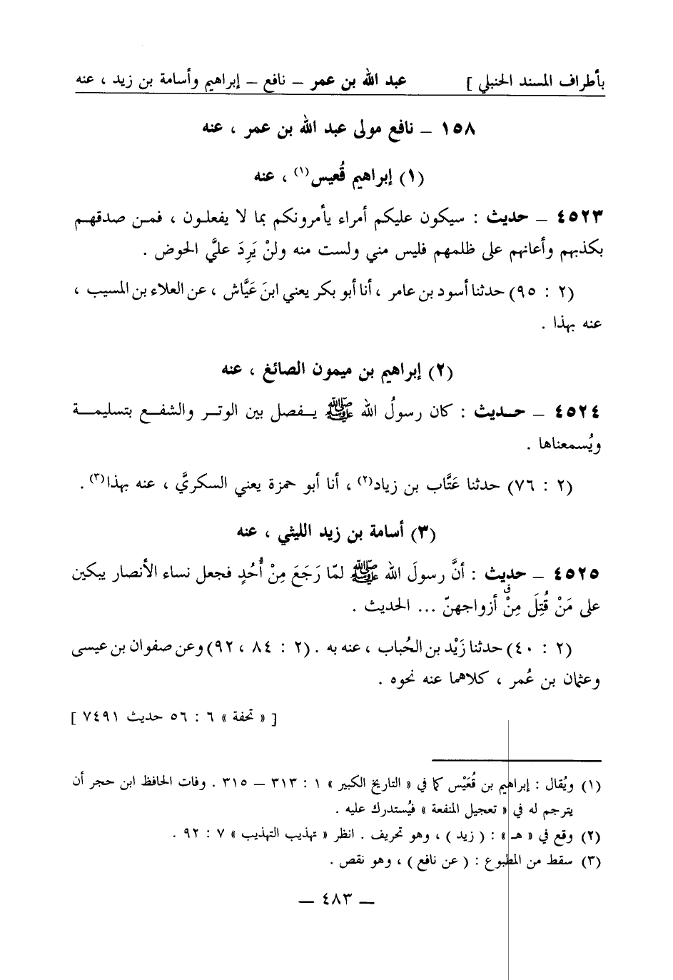 4525 -[ق] حديث: أنَّ رسولَ الله صَلَّى اللَّهُ عَلَيْهِ وَسَلَّمَ لمّا رَجَعَ من أُحُدٍ فجعل نساء الأنصار يبكين على من قُتِلَ من أزواجهنّ ... الحديث. (2: 40) حَدَّثَنا زيد بن الحُبَاب، عنه به. (2: 84، 92) وعن صفوان بن عيسى وعثمان بن عمر، كلاهما عنه نحوه.