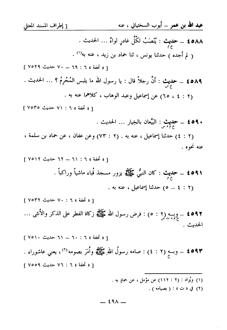 4590 -[خ م د س] حديث: البَيِّعان بالخِيار ... الحديث. (2: 4) حَدَّثَنا إسماعيل، عنه به. (2: 73) وعن عفان، عن حمّاد بن سَلَمة، عنه نحوه.