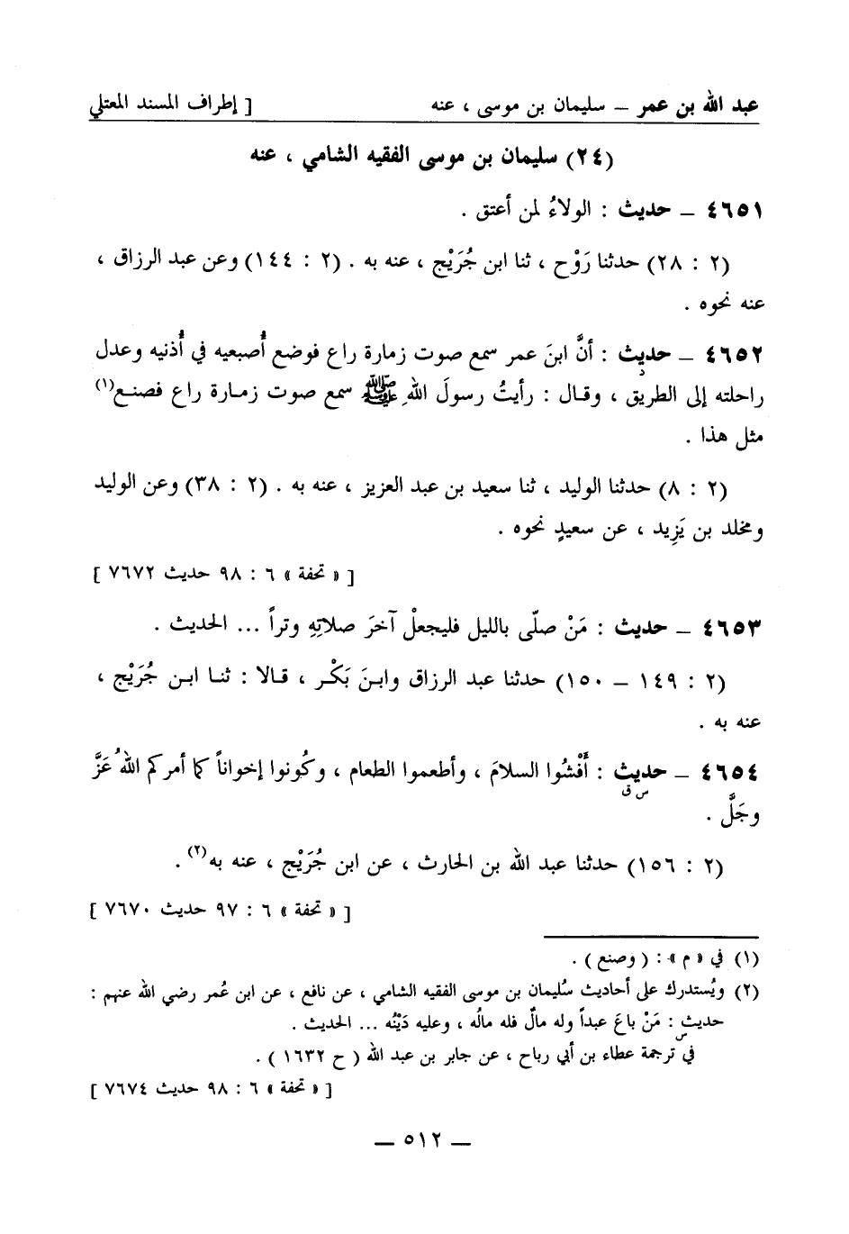 4650 - حديث: الولاءُ لمن أعتق. (2: 28) حَدَّثَنا رَوْح ثنا ابن جُرَيج، عنه به. (2: 144) وعن عبد الرزاق، عنه نحوه.