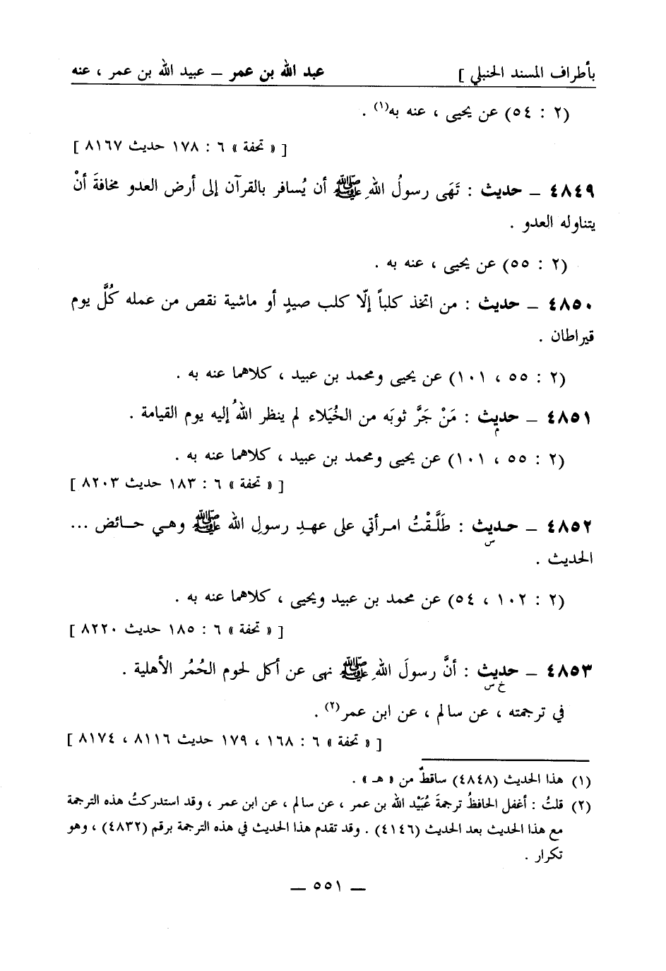 4852 -[س] حديث: طَلَّقْتُ امرأتي على عهدِ رسولِ الله صَلَّى اللَّهُ عَلَيْهِ وَسَلَّمَ وهي حائض ... الحديث. (2: 102، 54) عن محمد بن عُبَيد ويحيى كلاهما عنه به.