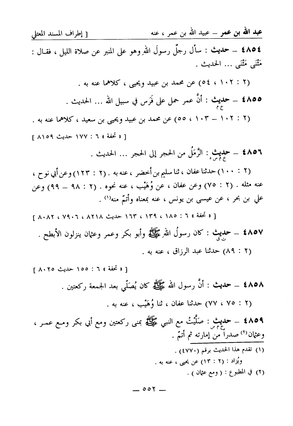4856 - (خ م س د) حديث: الرَّمَلُ من الحجر إلى الحجر ... الحديث. (2: 100) حَدَّثَنا عفان ثنا سليم بن أخضر، عنه به. (2: 123) وعن أبي نوح عنه مثله. (2: 75) وعن عفان عن وُهَيْب عنه نحوه. (2: 98 - 99) وعن علي بن بَحْر، عن عيسى بن يونس، عنه بمعناه وأتمّ منه.
