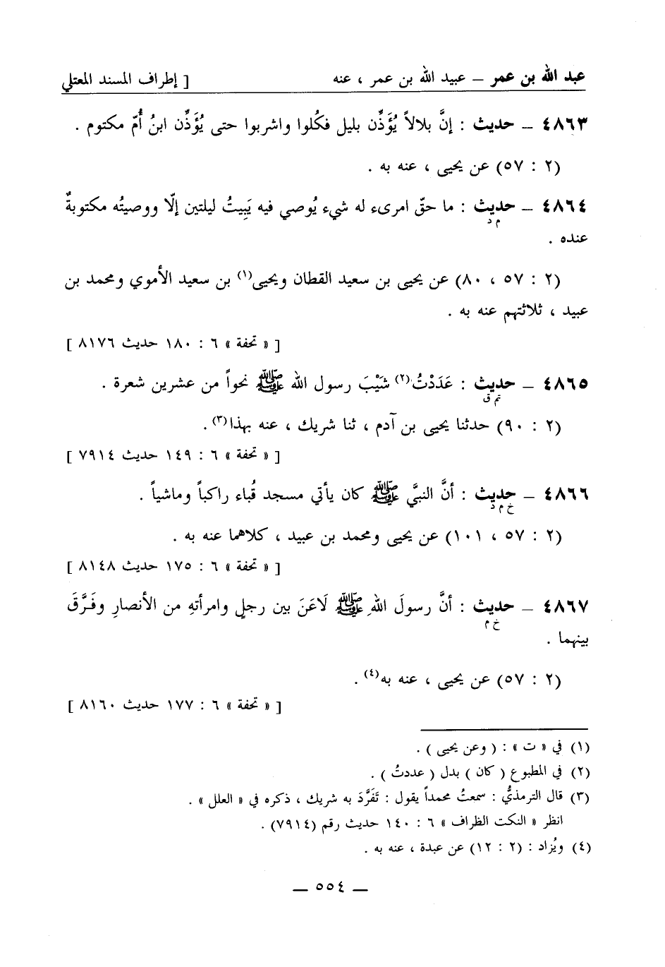 4864 -[م د] حديث: ما حقّ امرئ له شيء يُوصي فيه يَبِيتُ ليلتين إلا ووصيتُه مكتوبةٌ عنده. (2: 57، 80) عن يحيى بن سعيد القطان ويحيى بن سعيد الأموي، ومحمد بن عُبَيد ثلاثتهم عنه به.