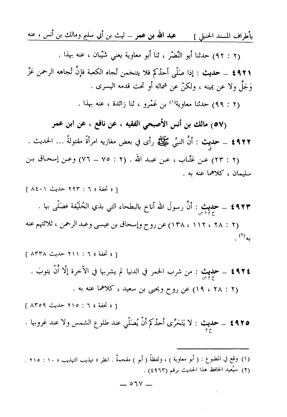 4923 -[خ م د س] حديث أنَّ رسولَ الله أناخ بالبطحاء التي بذي الحُلَيْفة فصَلّى بها. (2: 28، 112، 138) عن رَوْح وإسحاق بن عيسى وعبد الرحمن، ثلاثتهم عنه به.