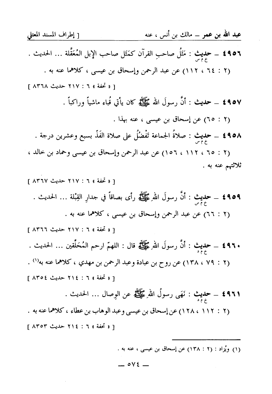 4957 - حديث: أنَّ رسولَ الله صَلَّى اللَّهُ عَلَيْهِ وَسَلَّمَ كان يأتي قُباء ماشياً وراكباً. (2: 65) عن إسحاق بن عيسى، عنه بهذا.