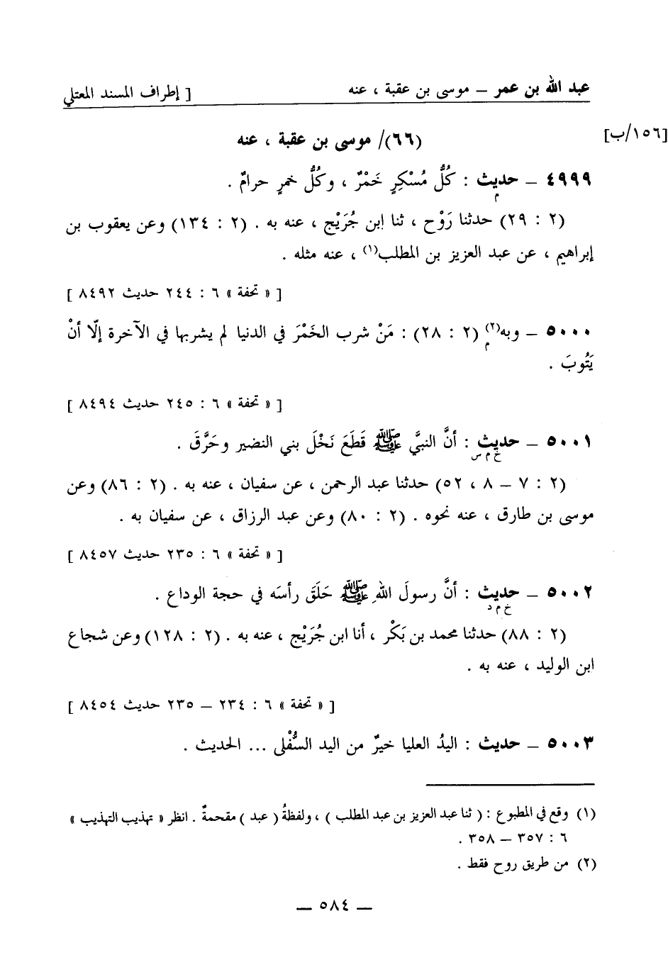 5001 -[خ م س] حديث: أنَّ النبيَّ صَلَّى اللَّهُ عَلَيْهِ وَسَلَّمَ قَطَعَ نَخْلَ بني النَّضْير وحَرَّقَ. (2: 7 - 8، 52) حَدَّثَنا عبد الرحمن عن سفيان عنه به. (2: 86) وعن موسى بن طارق، عنه نحوه. (2: 80) وعن عبد الرزاق، عن سفيان به.
