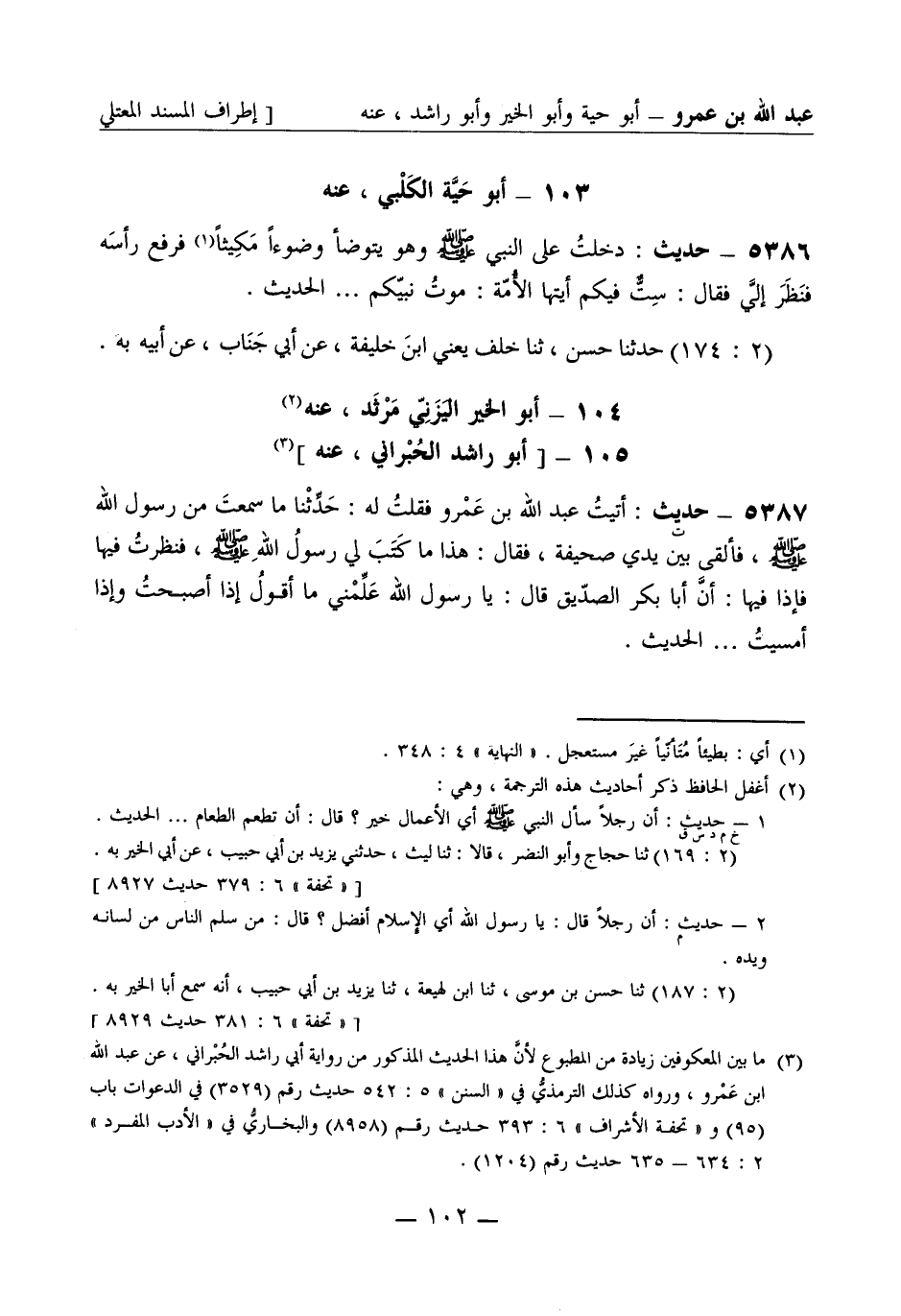 5387 -[ت] حديث أتيت عبد الله بن عمرو فقلت له:، حدثنا ما سمعت من رسول الله صَلَّى اللَّهُ عَلَيْهِ وَسَلَّمَ فألقى بين يدي صحيفة فقال هذا ما كتب لي رسول الله صَلَّى اللَّهُ عَلَيْهِ وَسَلَّمَ فنظرت فيها فإذا فيها: أن أبا بكر الصديق قال: يا رسول الله علمني ما أقول إذا أصبحت وإذا أمسيت ... الحديث -[103]-. (2: 196) حدثنا خلف بن الوليد، ثنا ابن عياش، عن محمد بن زياد الألهاني عنه به.